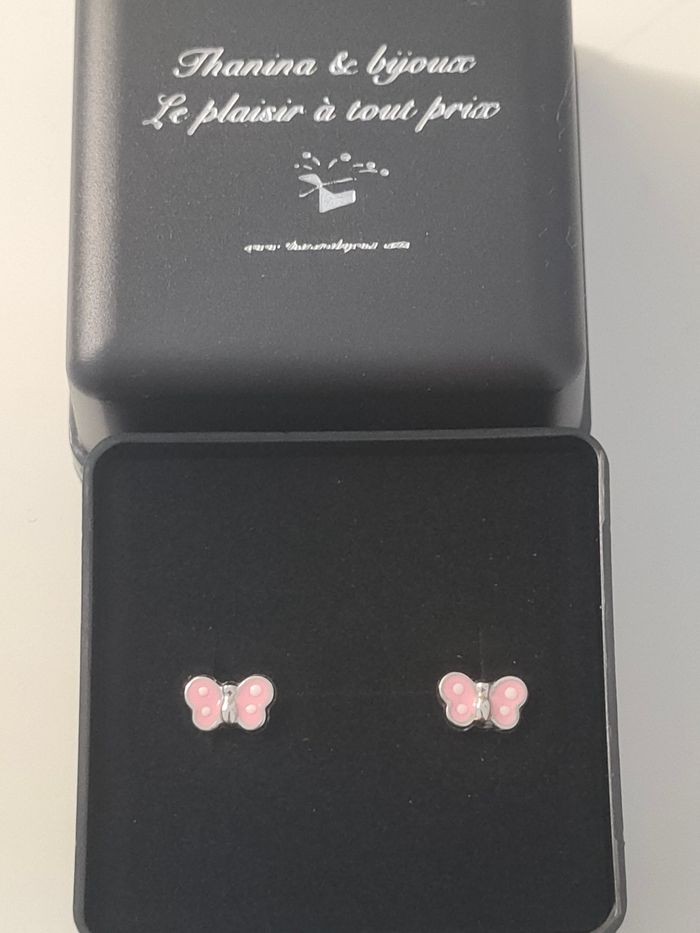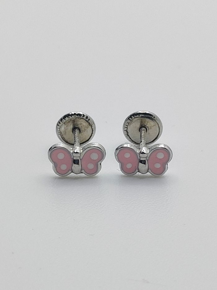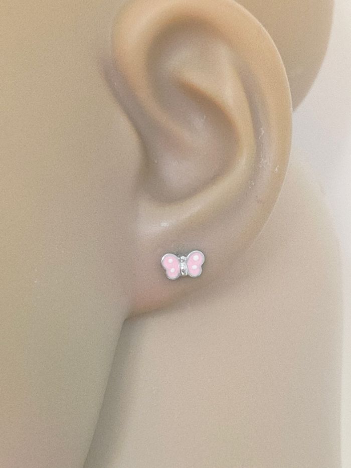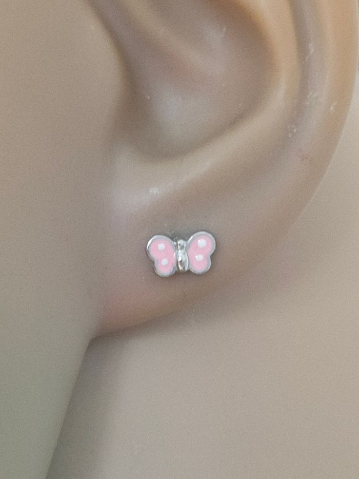 Bijoux féminin, boucles d'oreilles puces en argent rhodié papillon rosede 5mm de large, longueur 7mm, fermoir à visser