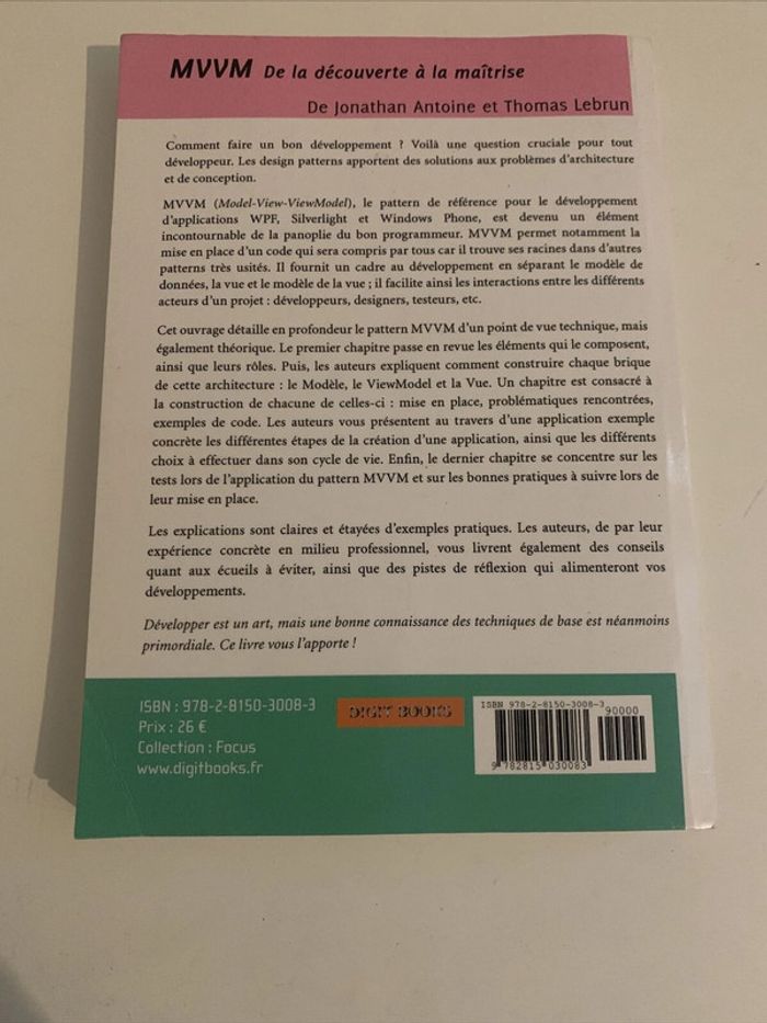 Livre MVVM De La Découverte À La Maîtrise - WPF, Silverlight, Windows Phone Comment faire un bon développement ? Voilà une question cruciale pour tout développeur. Les design patterns apportent des solutions aux problèmes d'architecture et de conception. MVVM (Model-View-ViewModel), le pattern de référence pour le développement d'applications Windows, Universal Apps, WPF, Silverlight et Windows Phone, est devenu un élément incontournable de la panoplie du bon programmeur.
