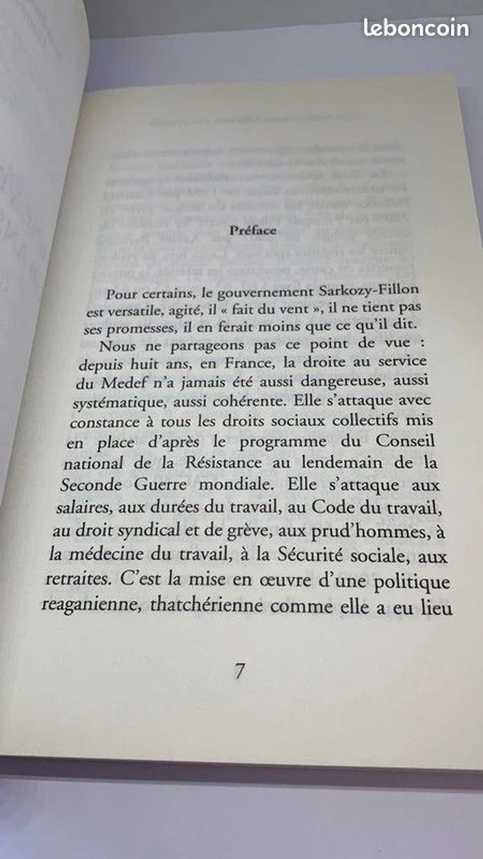 Une vraie retraite à 60 ans, c'est possible 10 questions, 10 réponses Gérard Filoche, Jean-Jacques Chavigné Dernières pages un peu jaunies En dix questions - dix réponses, ce livre nous apprend, de façon simple et chiffrée, pourquoi et comment se révolter et défendre son droit à un bon salaire, à une Sécurité sociale de haut niveau et à une vraie retraite. La France de 2010 n'a jamais été aussi riche. En toute logique, les salaires devraient augmenter massivement et la protection sociale devrait se renforcer. Pourtant, la droite s'attaque aujourd'hui frontalement au droit à la retraite. Alors qu'il n'y a, si on le veut, aucun problème pour financer le droit à la retraite à 60 ans à taux plein (avec 75% de reversement, calculé sur les dix meilleures années et en garantissant qu'aucune ne sera inférieure au Smic), les banques, les profiteurs, spéculateurs organisent une campagne de propagande mensongère, falsifient les chiffres et les paramètres. Un texte "coup de poing", richement documenté, écrit dans un style incisif, qui apporte une alternative à la réforme à venir, et des solutions pour demain. Éditeur(s) Jean-Claude Gawsewitch Auteur(s) Gérard Filoche, Jean-Jacques Chavigné Parution 16/04/2010
