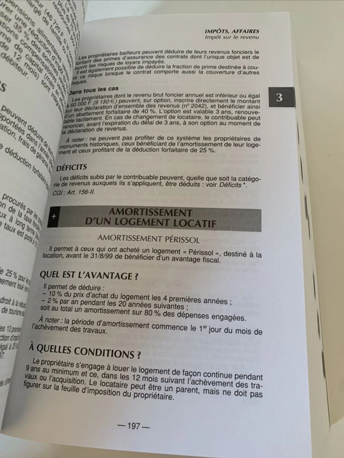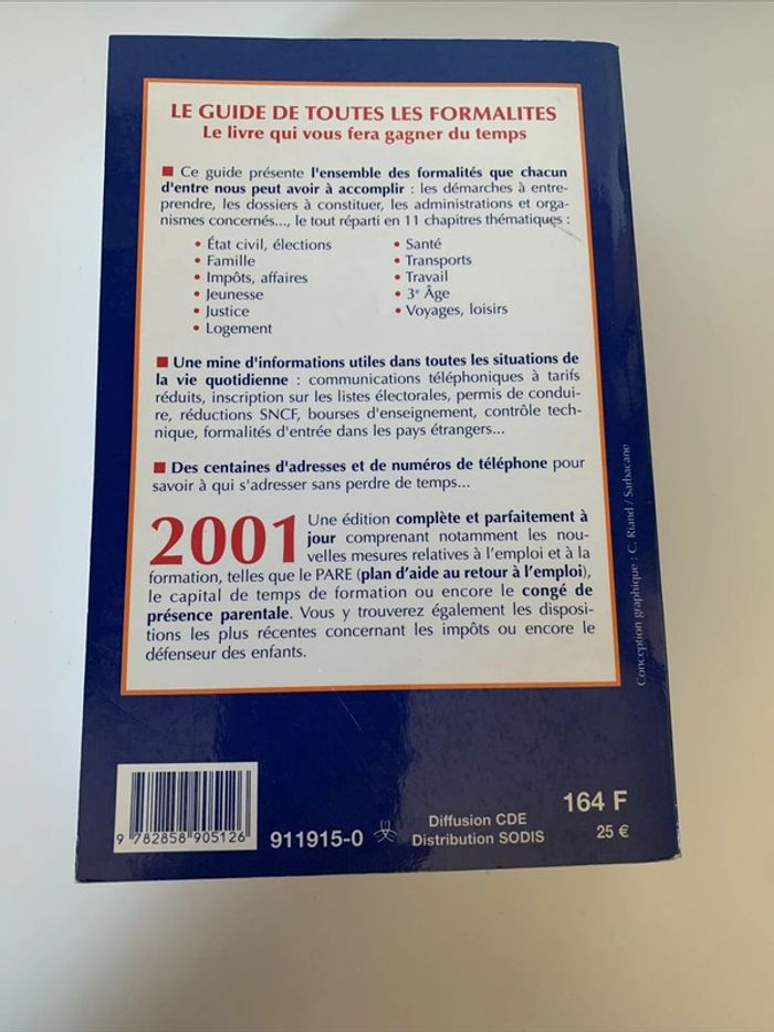 Ce guide présente l'ensemble des formalités que chacun d'entre nous peut avoir à accomplir : les démarches à entreprendre, les dossiers à constituer, les administrations et organismes concernés..., le tout réparti en 11 chapitres thématiques : état civil, élections, famille, impôts, affaires, jeunesse, justice, logement, santé, transports, travail, 3e âge, voyages, loisirs. Une mine d'informations utiles dans toutes les situations de la vie quotidienne : communications téléphoniques à tarifs réduits, inscription sur les listes électorales, permis de conduire, réductions SNCF, bourses d'enseignement, contrôle technique, formalités d'entrée dans les pays étrangers... Des centaines d'adresses et de numéros de téléphone pour savoir à qui s'adresser sans perdre de temps... Une édition complète et parfaitement à jour comprenant notamment les nouvelles mesures relatives à l'emploi et à la formation, telles que le PARE (plan d'aide au retour à l'emploi), le capital de temps de formation ou encore le congé de présence parentale. Vous y trouverez également les dispositions les plus récentes concernant les impôts ou encore le défenseur des enfants.