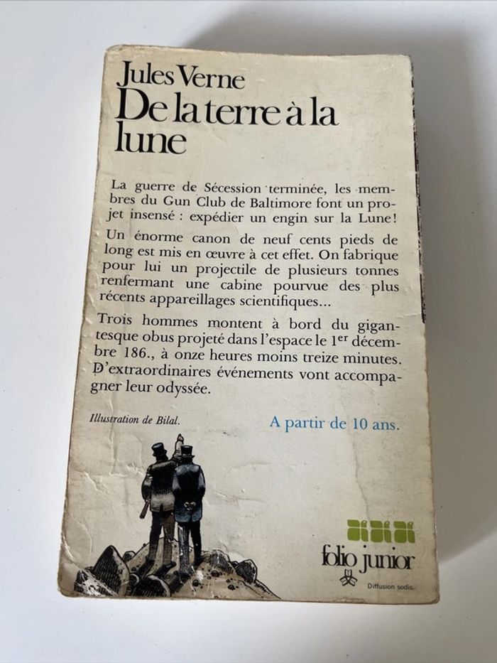 Livre Jules Verne - De La Terre À La Lune - Folio Junior Année 1977 Après la fin de la Guerre de Sécession, le Gun Club de Baltimore, club d'artilleurs, végète par manque d'activité. Son président, Impey Barbicane, propose très sérieusement d'envoyer un boulet de canon sur la Lune. Après plusieurs réunions, le Gun Club s'organise et lance une collecte de fonds en direction de toute la planète. Après avoir récolté l’argent nécessaire, le projet prend forme sous la forme d'un gigantesque canon d'une conception inspirée des Columbiad américains...