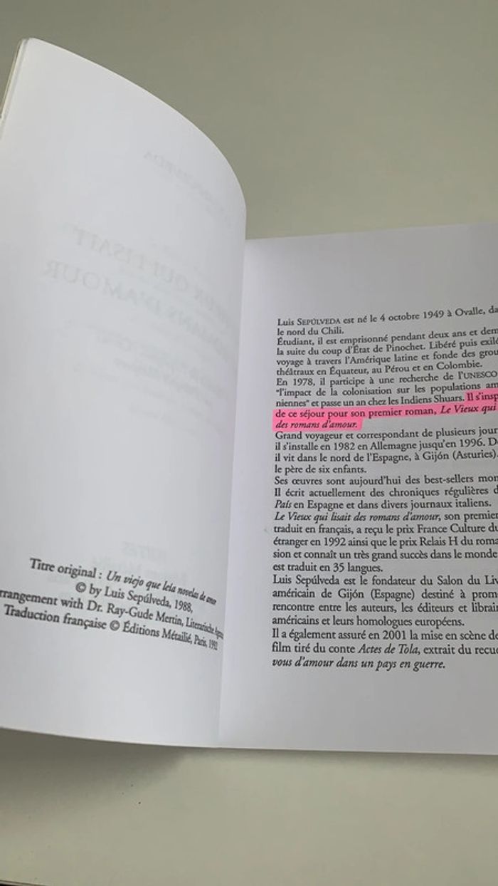 Livre Le Vieux qui lisait des Romans d’Amour - Luis Sepulveda Editions Métailié Quelques pages stabilotées