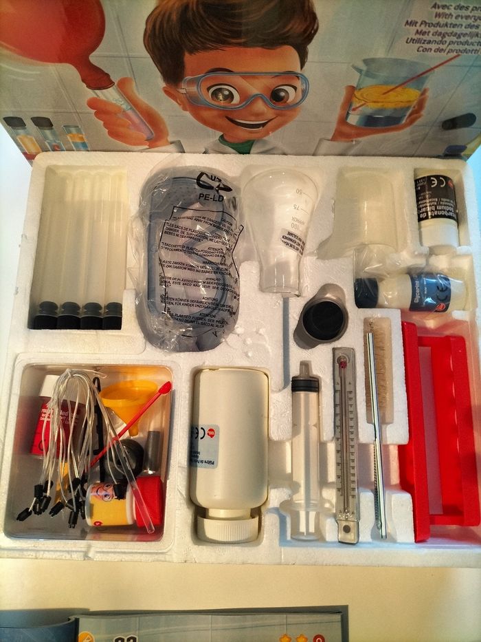 Kit de chimie avec lequel on peut réaliser 150 expériences sans danger avec des produits courants. Le matériel de chimie est fourni dans la boîte. L'emballage est d'origine et peut donc être un peu abîmé mais le contenu est en parfait état, il ne manque rien.