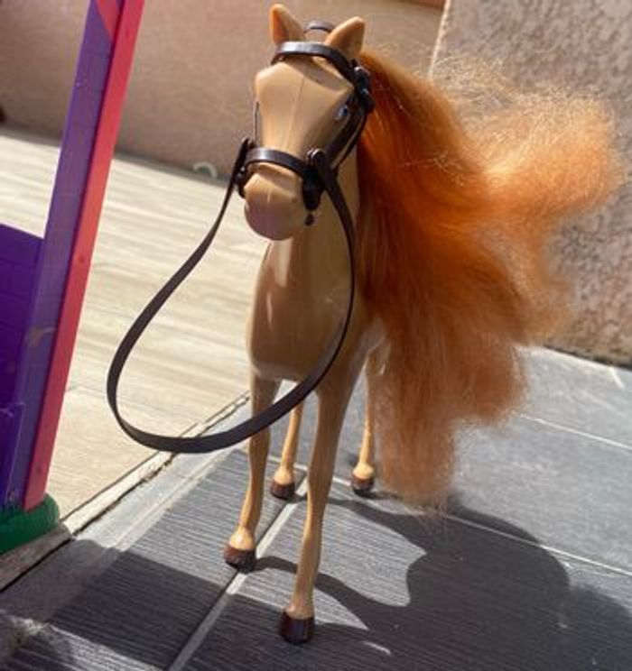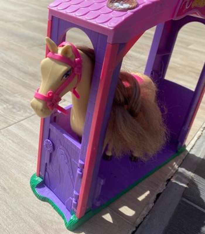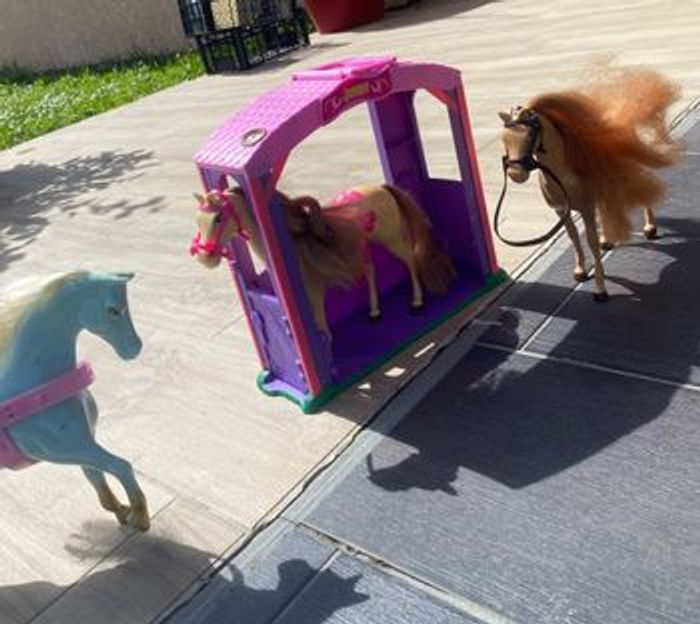 Vend écurie Barbie ainsi que 3 chevaux . Attention l’écurie a quelques taches cf dernière photos