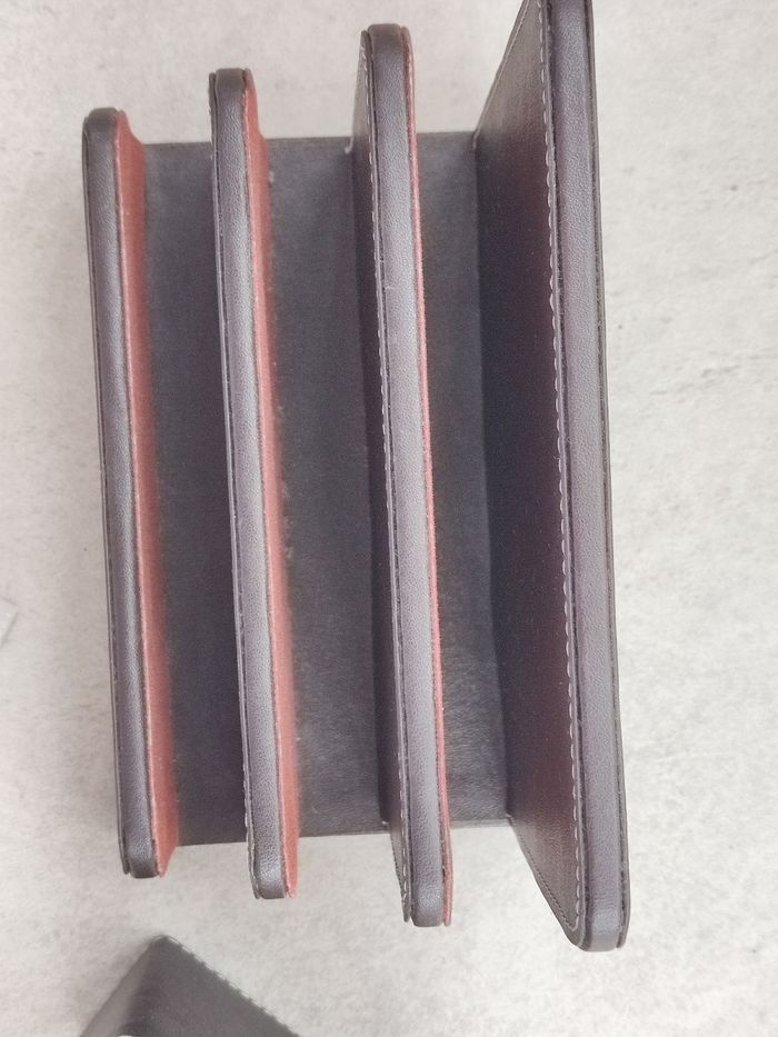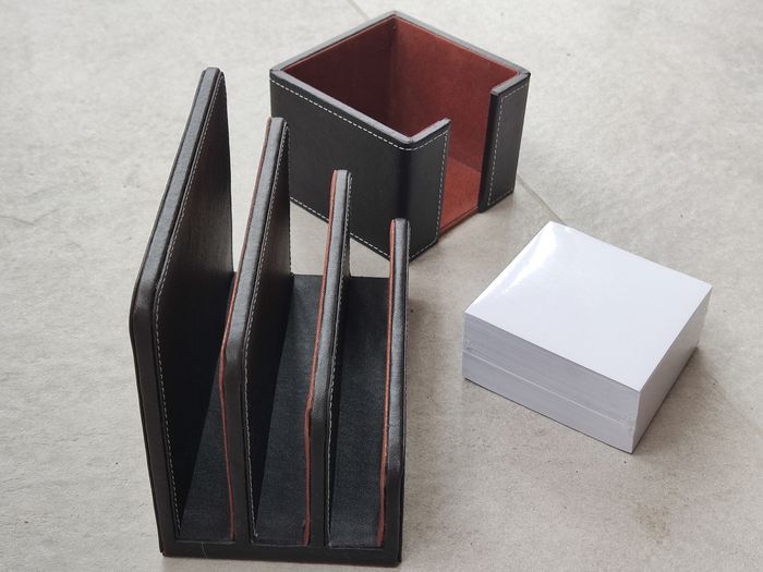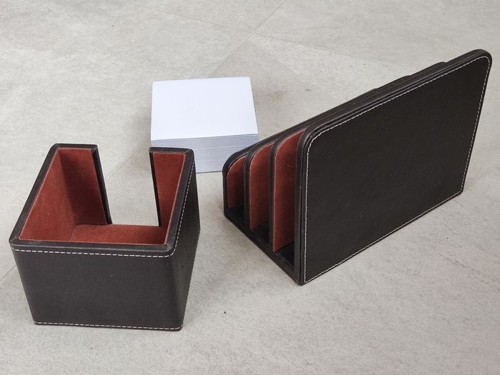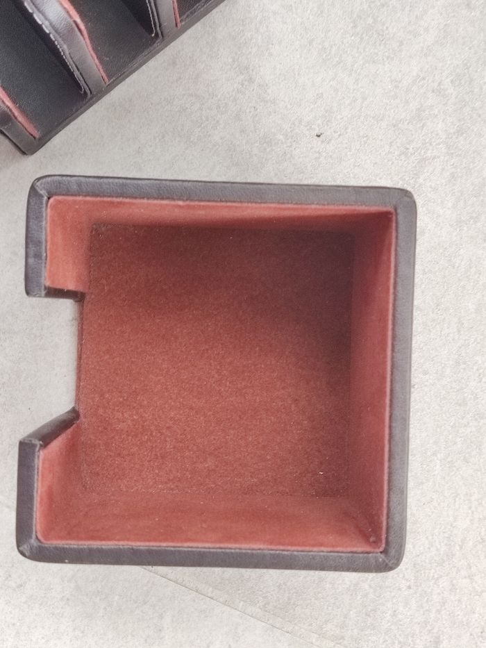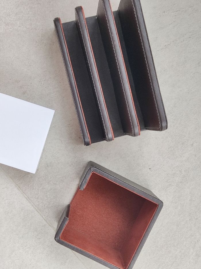 Intérieur en feutrine. Extérieur en imitation cuir. Dimensions porte post it : 10,5 x 10,5 x 8 cm Dimensions porte courrier : 17,5 cm x 10 cm x 14 cm. Bloc de feuilles blanches neuf, adapté au porte post it. Rendez vous possible sur Collegien ou Coulommiers