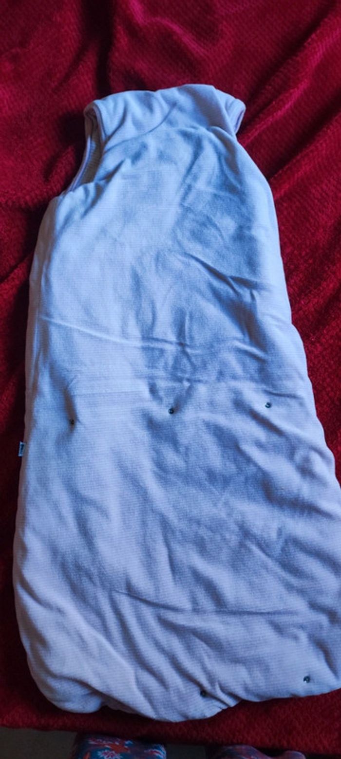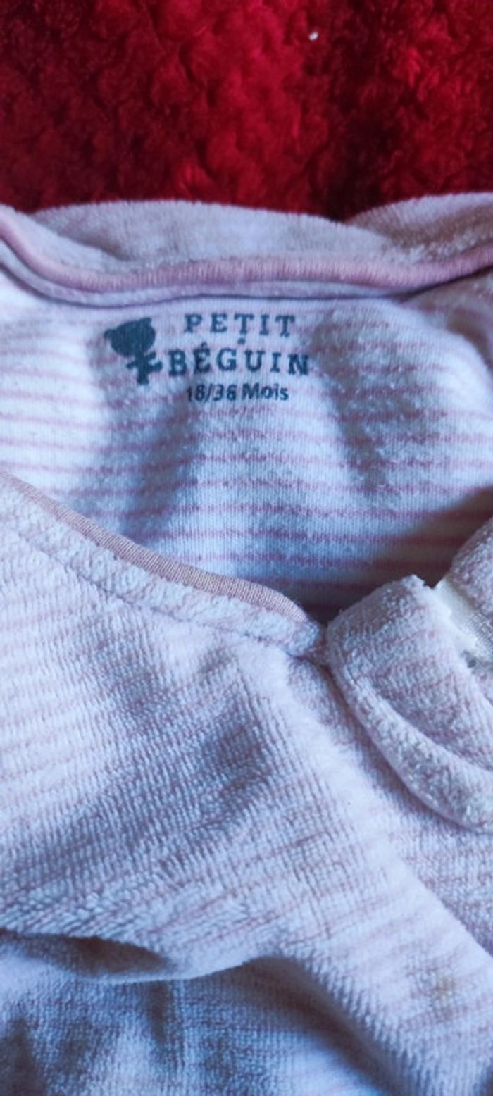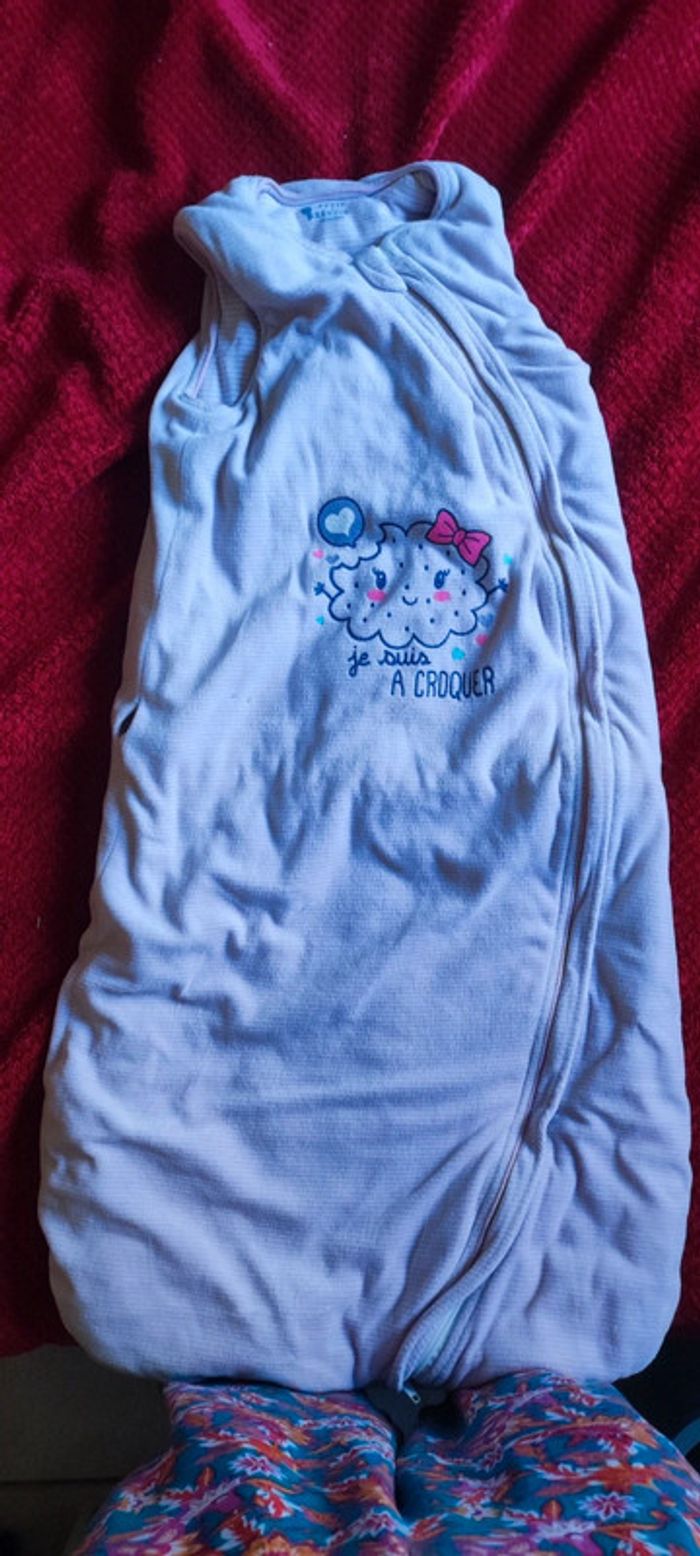 Gigoteuse chaude petit béguin, rose. Décousue sur un côté (voir photo), si vous savez coudre cela sera vite réparé :) N'étant pas bonne couturière je n'ai pas pris le temps de le faire, cela n'empêche en rien son utilisation Elle s'est un peu décolorée avec le lavage 18/36 mois
