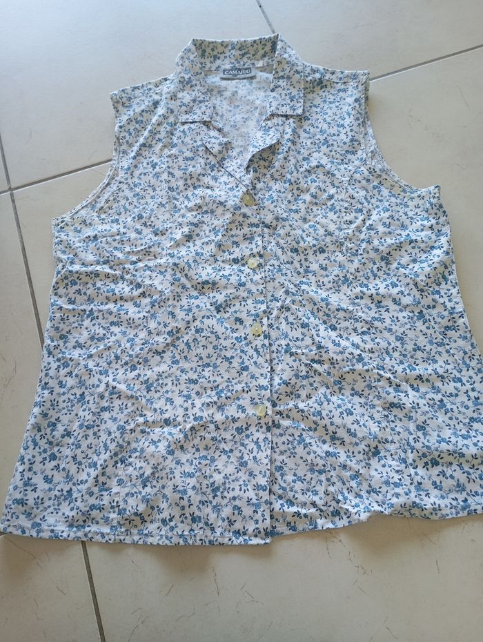 Chemisette été sans manche Blanche fleurs bleues cintrée Marque camaïeu 100% coton fabriqué en France Taille 3 Très bon état