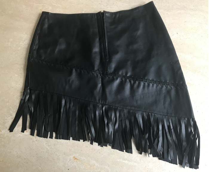 MINI-JUPE DE LA MARQUE "NEW LOOK" Coloris : Noir Taille : 40 Vérifiez toujours les mesures mentionnées ci-dessous car d'une marque à l'autre, les dimensions peuvent varier. Toutes les mesures ont toujours été prises à plat. Tour de taille : 39,5 cm (il faut donc multiplier par 2 pour obtenir le tour de taille complet). Longueur : 40 cm pour le côté le plus courtes 51 cm pour le côté le plus long). Modèle asymétrique. Fermeture éclair à l'arrière de la taille. Franges dans le bas. Doublée. Matière : cuir synthétique. D'occasion en très bon état (pas de taches, ni de trous ou d'accrocs).