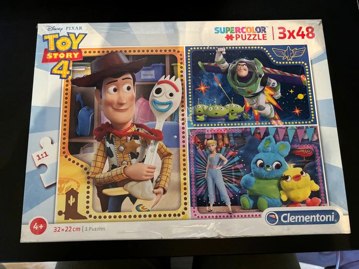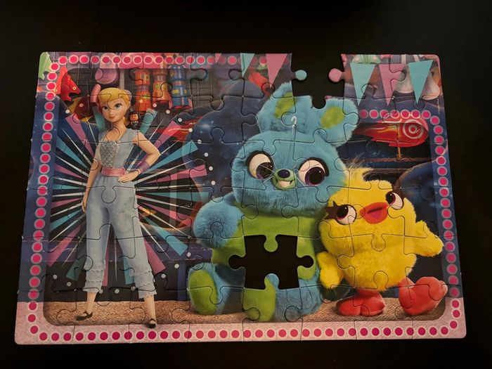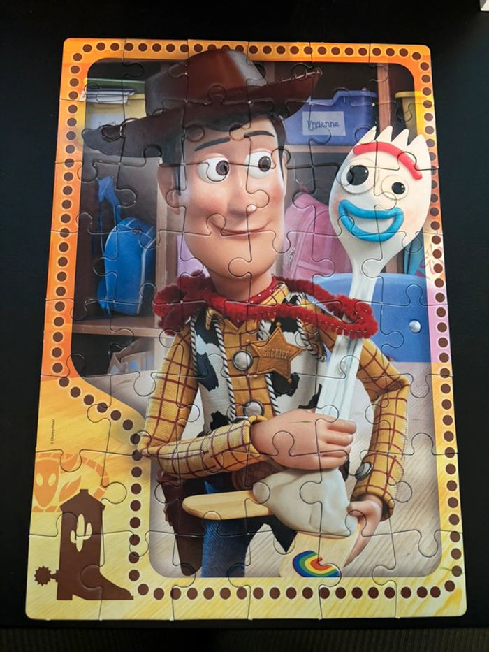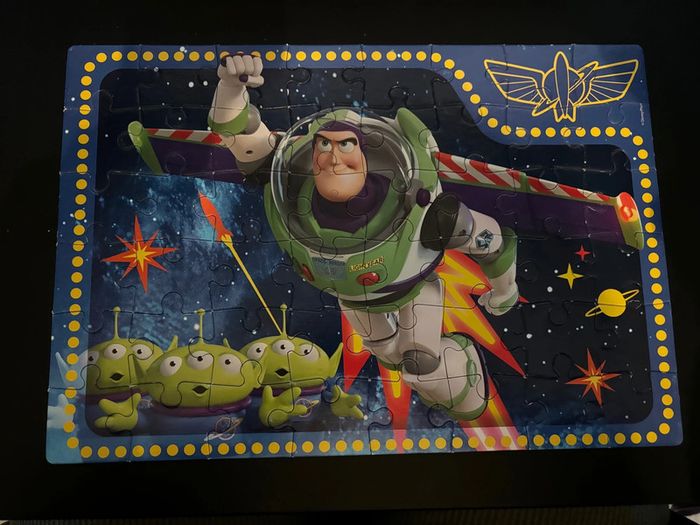 Puzzle Toy Story en excellent état, 2 puzzles sur les 3 sont complets. Manque 2 pièces dans le 3e Vendu avec support visuel fait maison (aide au repérage spatial)