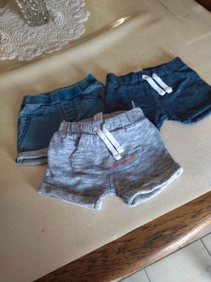 Lot de 3 shorts bébés, taille 62/68 cm. 2 taille 68 et 1 taille 62 .Très bon état . Le short en jean,la ceinture élastique un peu usée.(dernière photo).