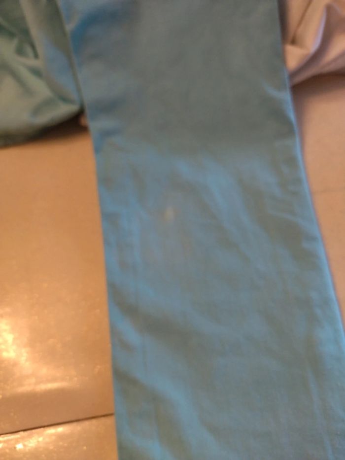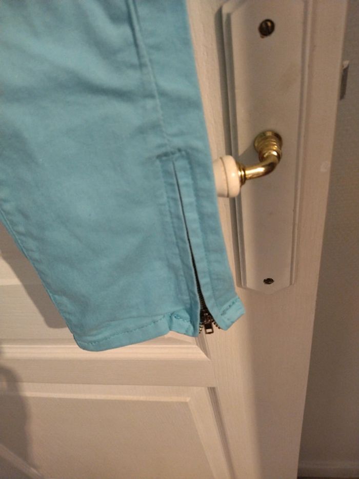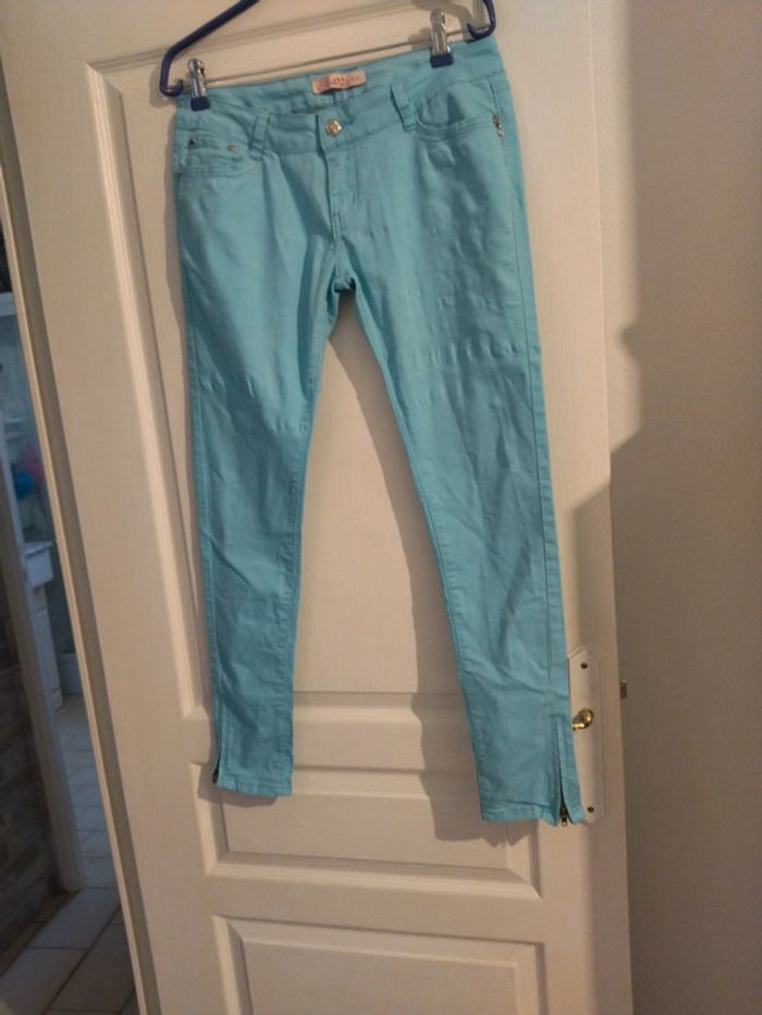 Pantalon bleu turquoise en bon état. Taille 42. Fermeture éclair en bas des jambes . Taille basse . Petite tâche jambe( dernière photo)
