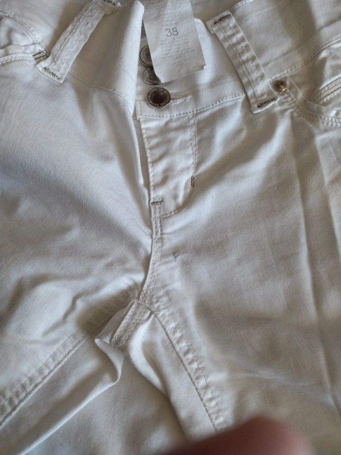 Pantalon jean fin blanc . Taille 38 . Acheter mais trop petit pour moi. Petit trou qui a été racommoder sous la braguette,qui n'a pas été mentionné lors de l'achat. Je suis honnête, je le signale