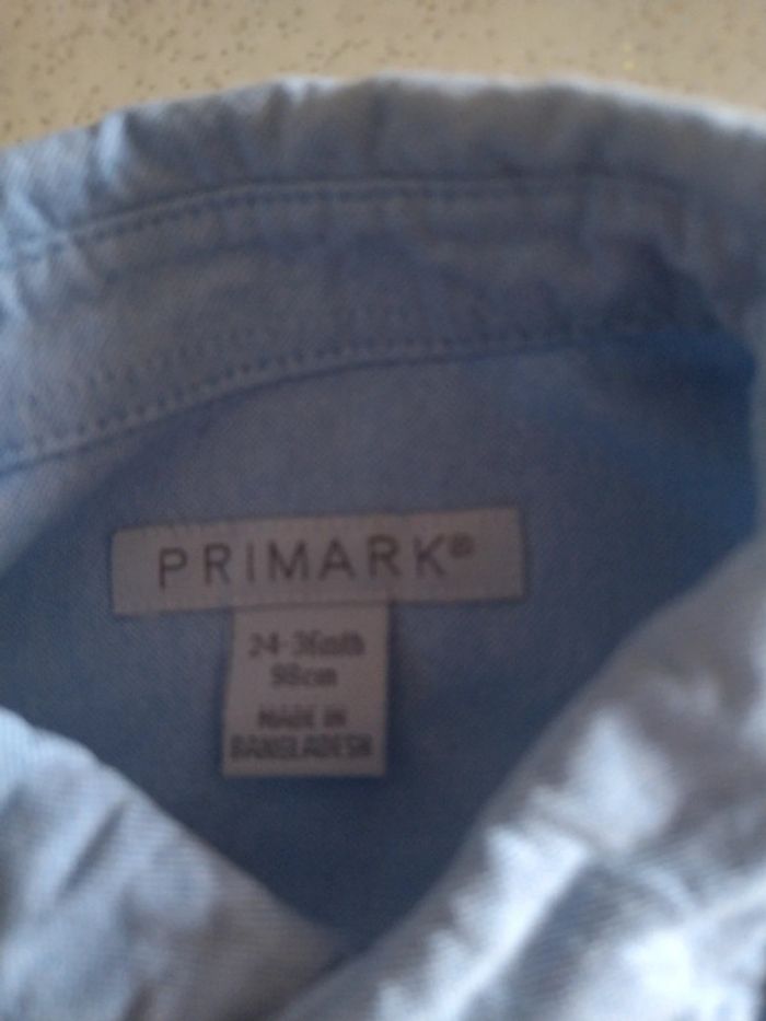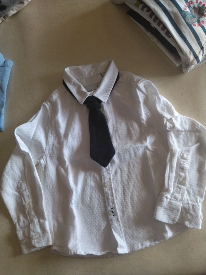 1 chemise bleue manches courtes et 1 chemise blanche manches longues et sa cravate. Taille 24/36 mois. Très bon état. LH, Primark.