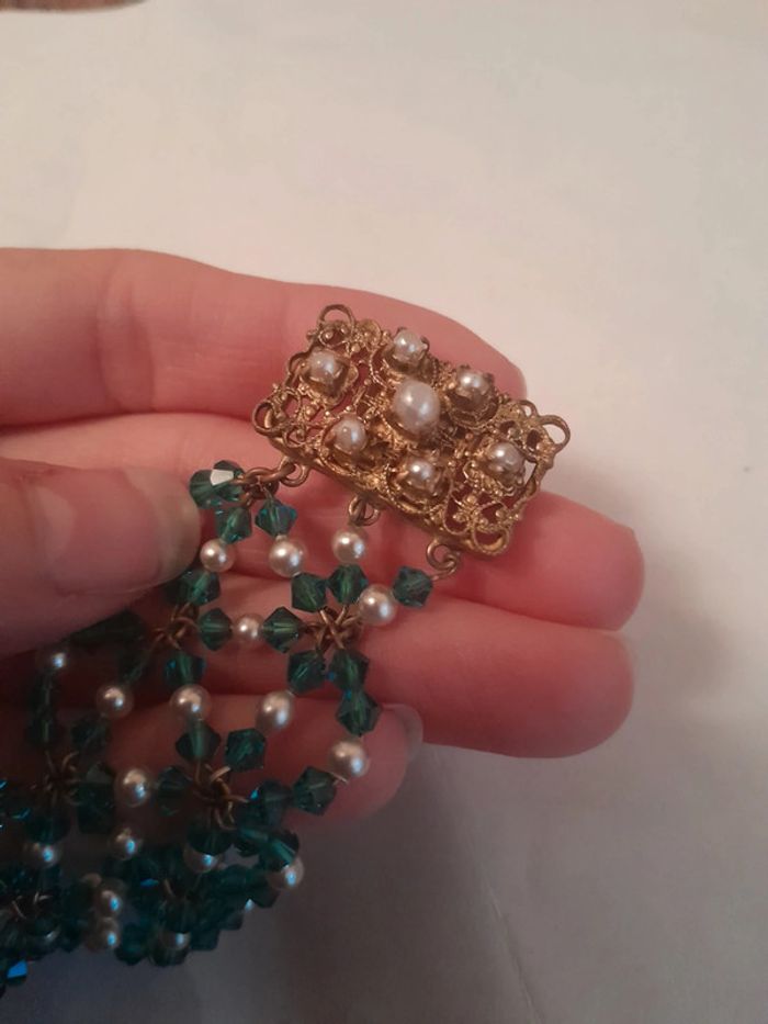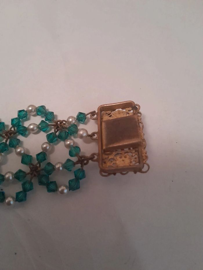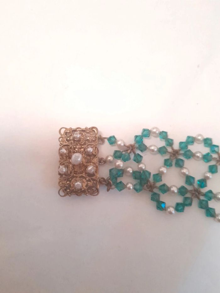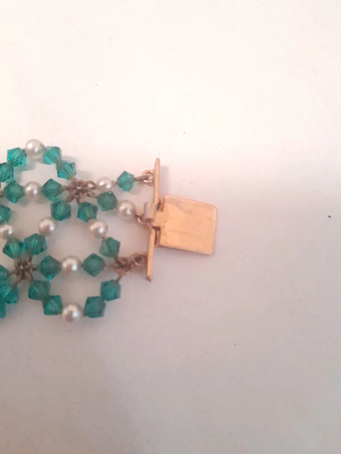 Tbe général très belle qualité. Couleur bleu vert. Nacre des perles un peu partie sur le fermoir. En fantaisie. Longueur totale 17.5cm #ontherabijou #braceletvintage #braceletancien