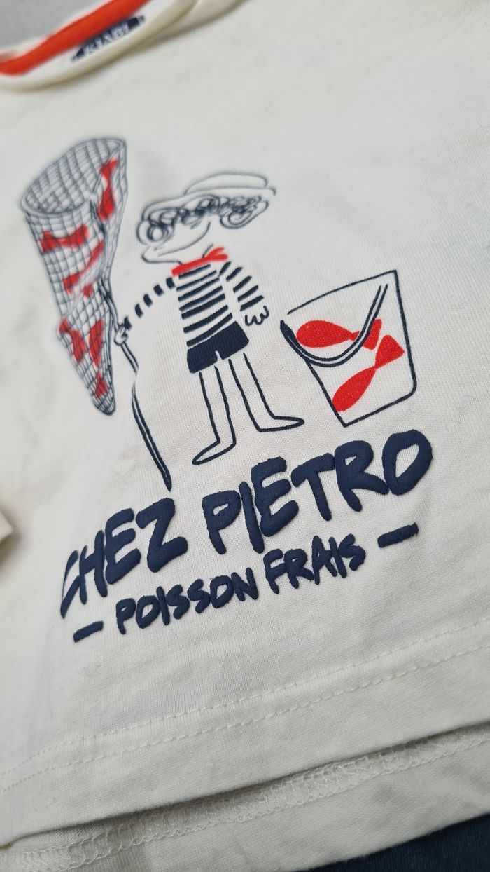 T-shirt thème de la mer, avec inscription "Chez Pietro poisson frais" en relief et dessins devant et derrière. Marque Kiabi. Pantalon avec fermeture par bouton mais taille élastique pour plus de confort. Marque NPO BABY.
