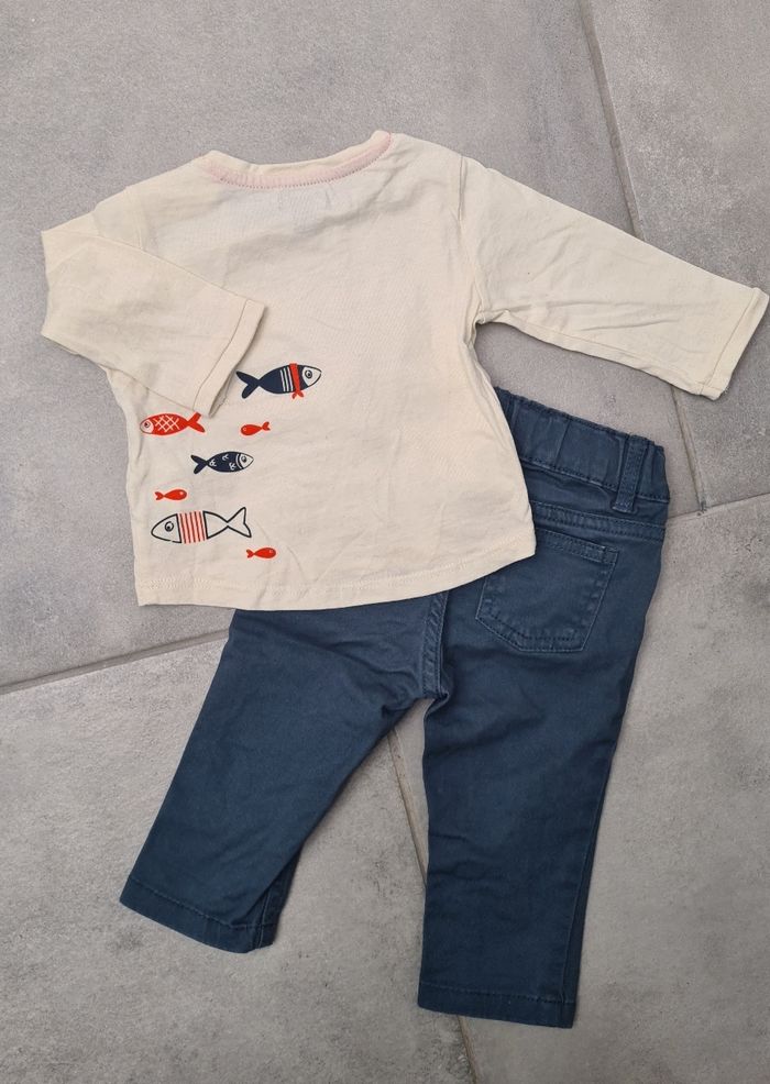 Ensemble T-shirt manches longues beige et pantalon bleu 6 mois - photo numéro 2