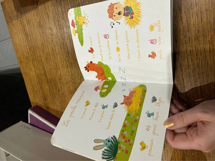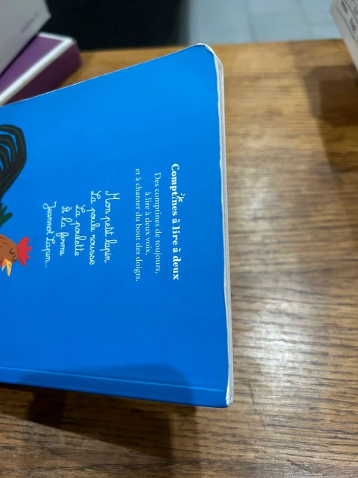Des traces d’usures sur le contour sinon nickel Les comptines se présentent sous forme de phrases avec des dessins sur certains mot Super pour les moments à deux mais aussi pour l’apprentissage des mots des gestes selon si vous décider de les mimer ou pas
