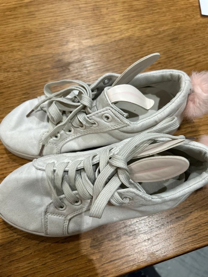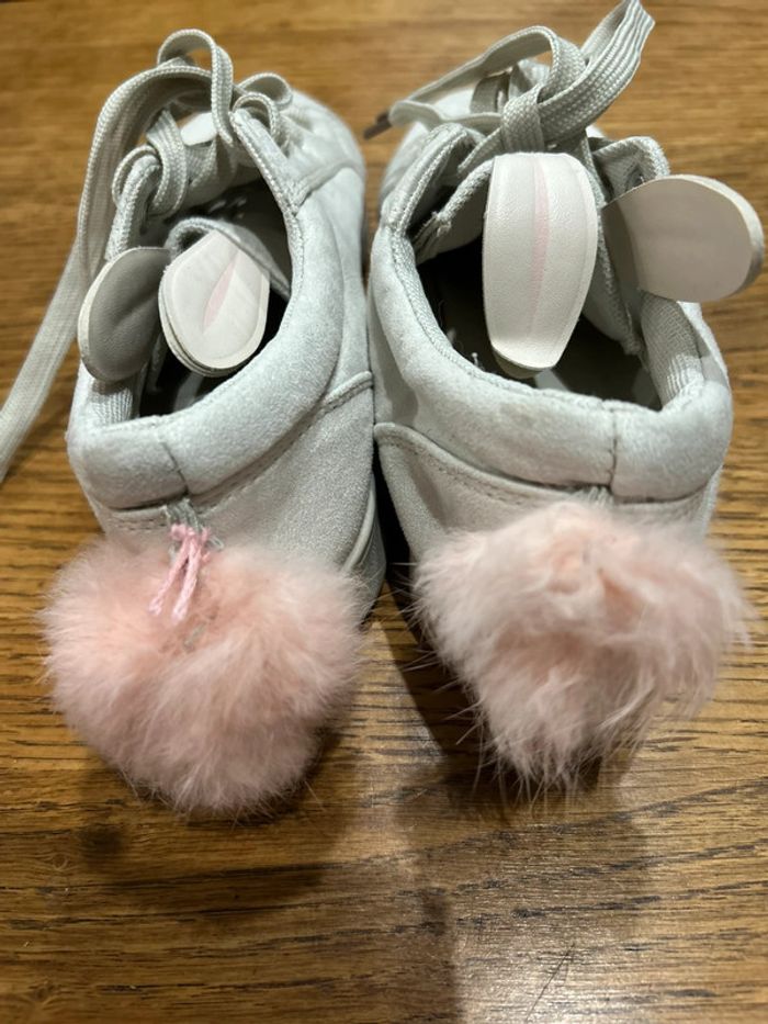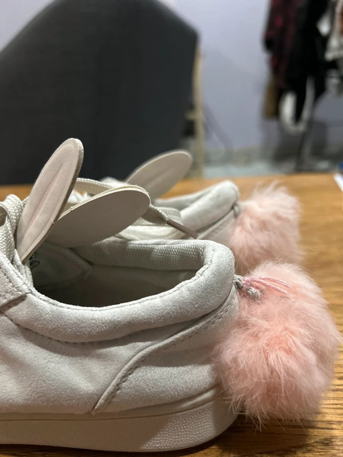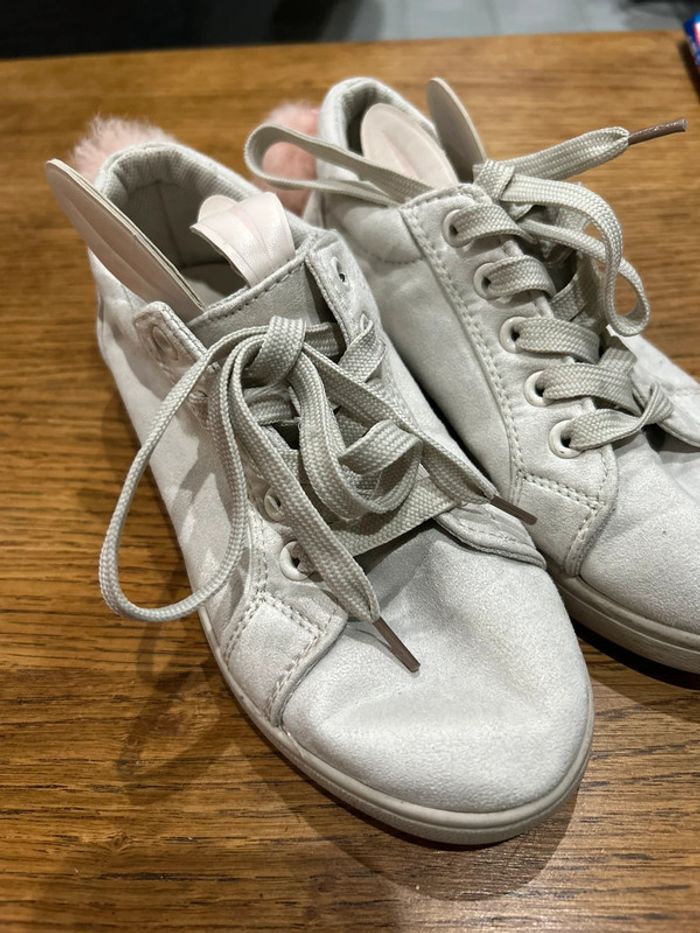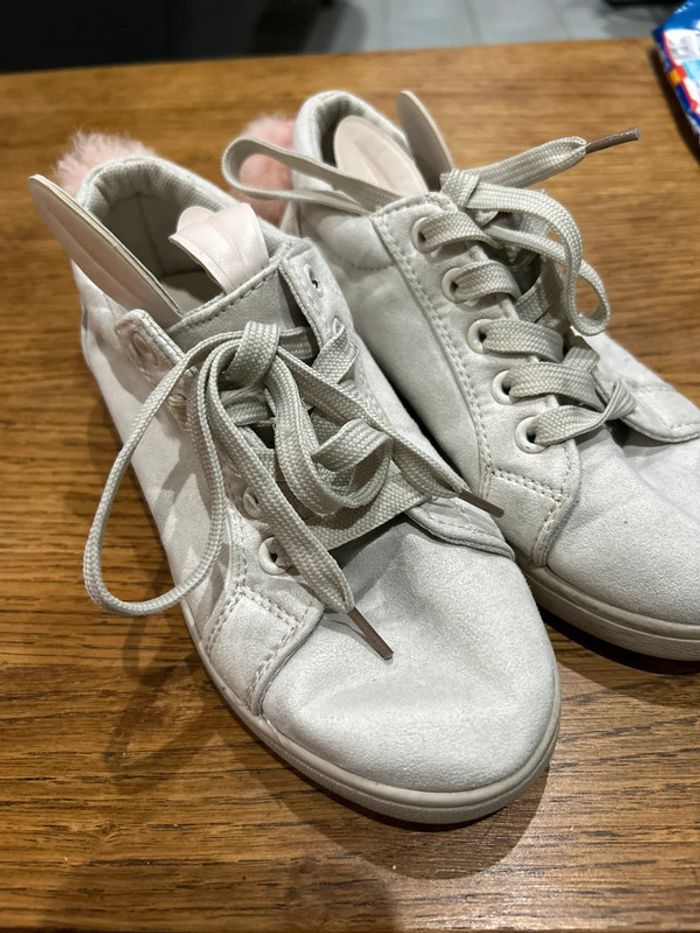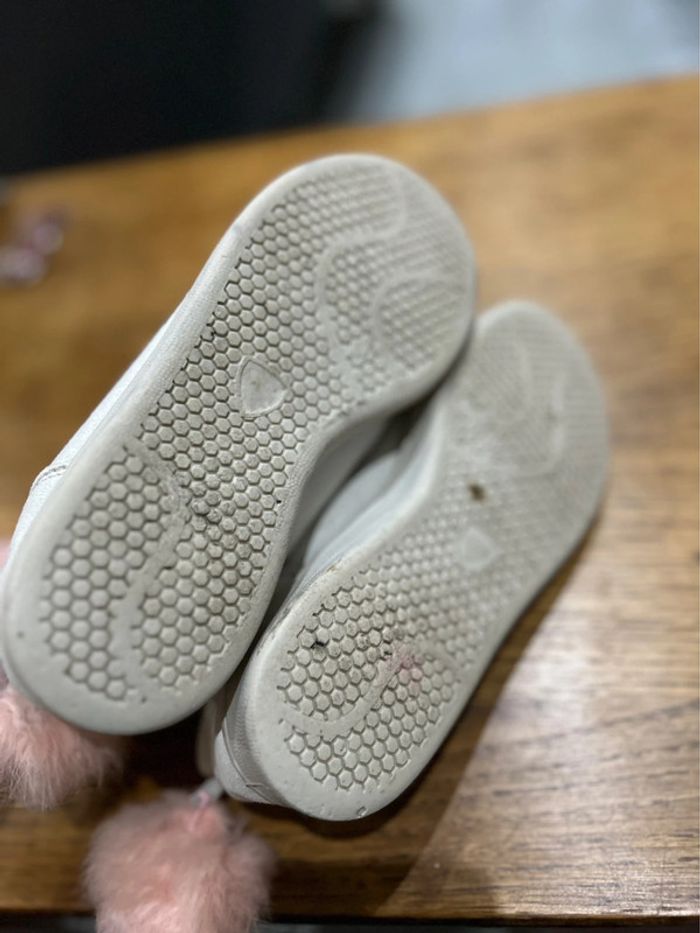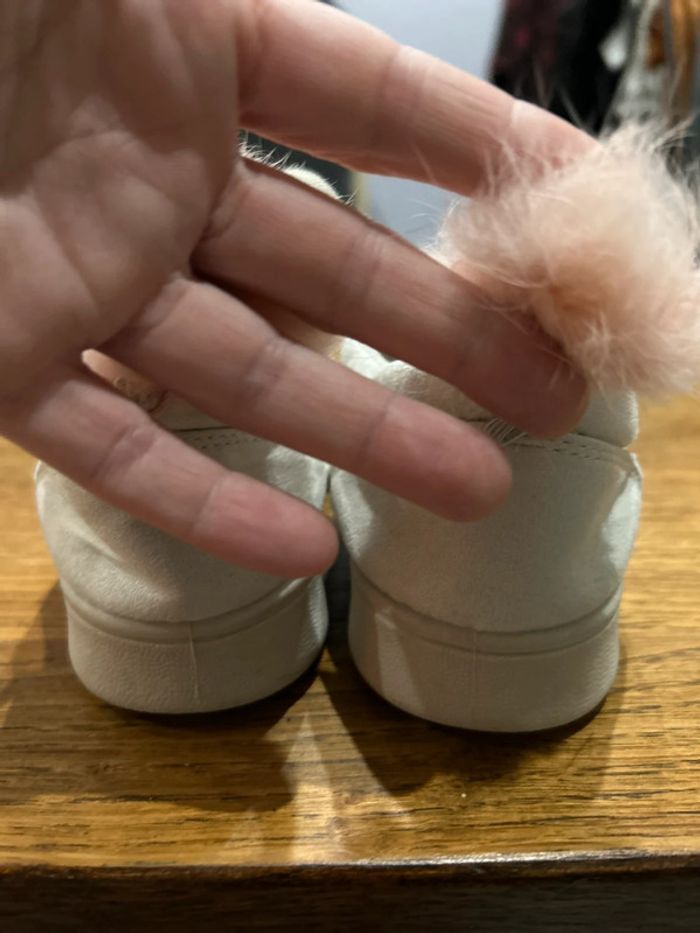 Des baskets qui ont été très peu portées ( deux fois de mémoire) pas d’usure sur la semelle. Qui n’ont pas été lavées encore d’où la saleté du sol sous les pieds. Toutes douces sur le dessus comme un petit lapin Il y a tout de même des traces d’utilisation : un ponton arrière un peu plus long que l’autre qui a été décroché et rattaché moins proche. Un des oreille de lapin un peu dédoublé sur la fin