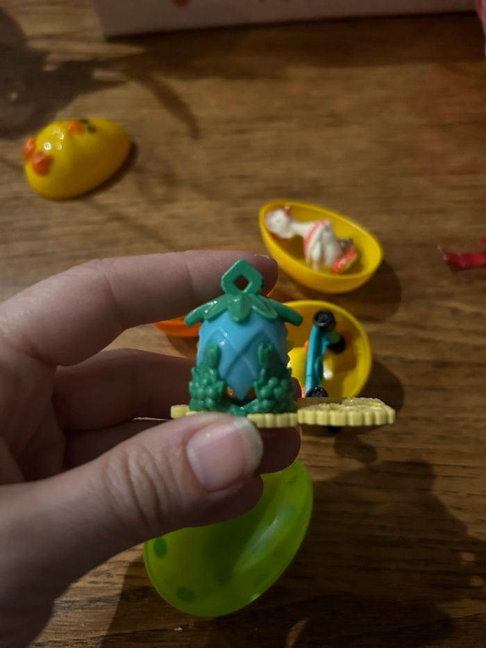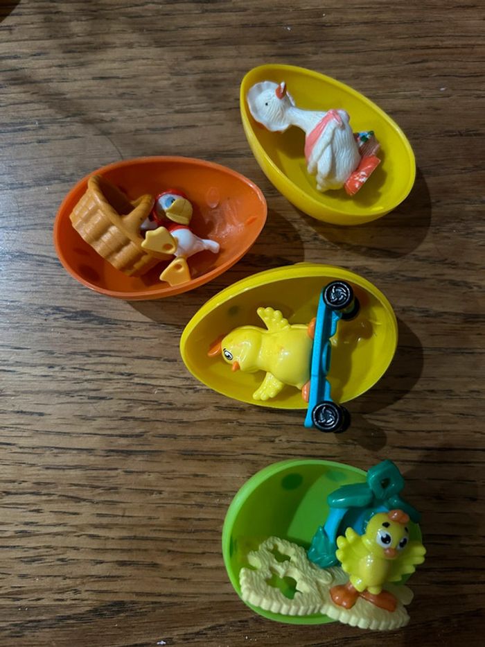 Sachets contenant des œufs en plastiques s’ouvrant pour découvrir des figurines surprise plutôt galimacés en rapport à avec pâque de chez kinder dont une Disney Cf photos Très bon état général mais comme les œufs ont des petits effacements et la poule des petites marques je mets bon état