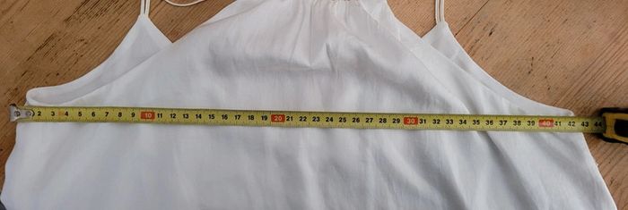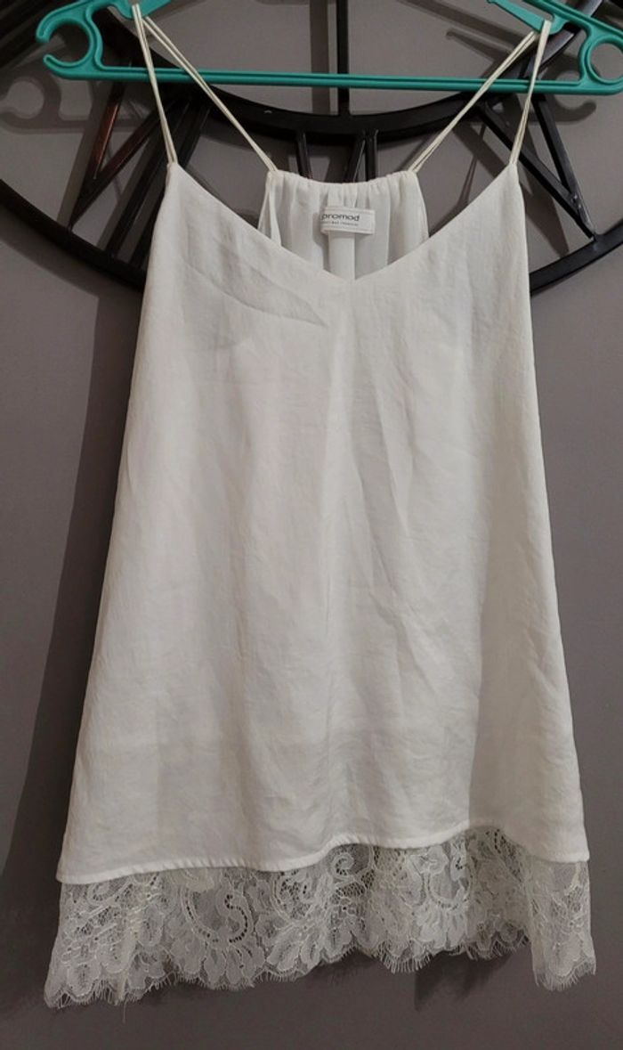 Très joli haut Promod Blanc Taille M Doublé, la doublure à une finition dentelle sur le bas. Étiquette intérieur enlevée. Jamais porté. La longueur indiqué est du haut de la bretelle jusqu'à bas de la dentelle.