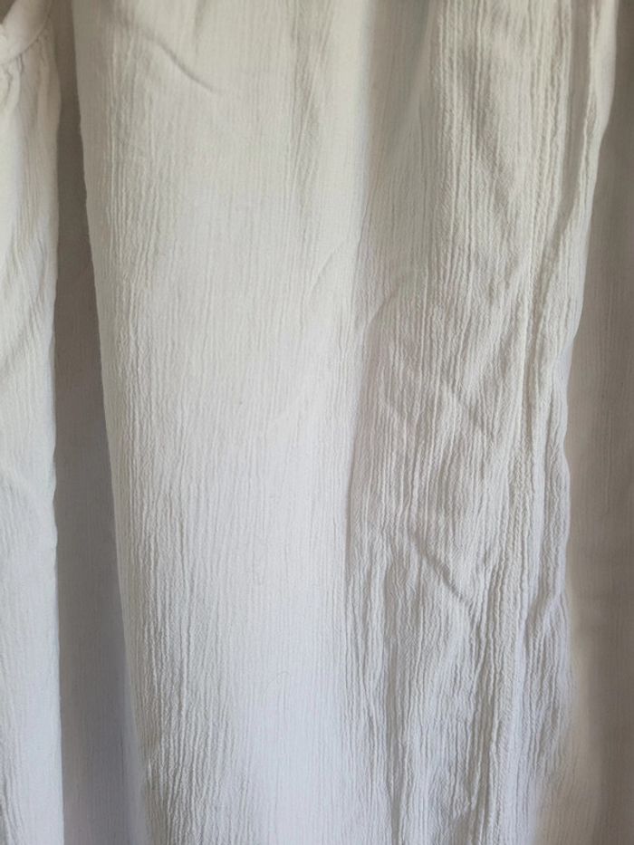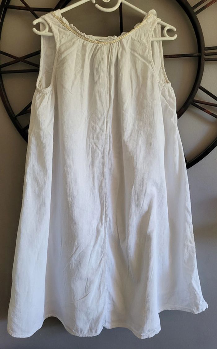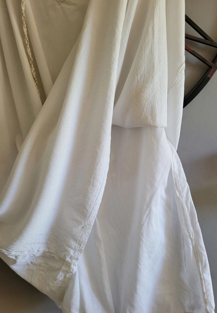 Très joli robe blanche Promod Fluide, évasée, cordon en haut de la robe avec fils brillant doré Doublé, elle n'est pas transparente. Taille 36 mais peut convenir aussi à un 38 Peut se porter avec une ceinture. Je mesure 1m67 elle m'arrive au dessus du genou. En très bon état