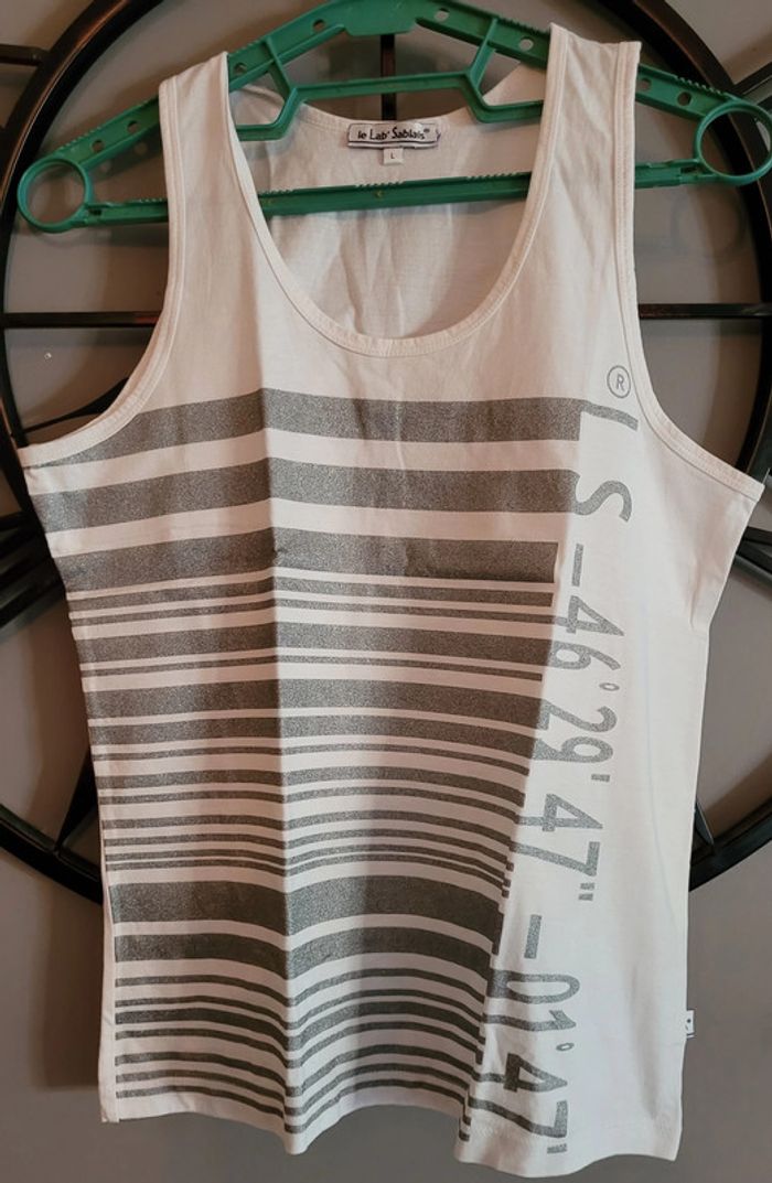Très joli tee shirt femme sans manches Taille L Marque le Lab'Sablais Blanc, rayures grises brillantes avec imprimé, uni au dos En parfait état comme neuf