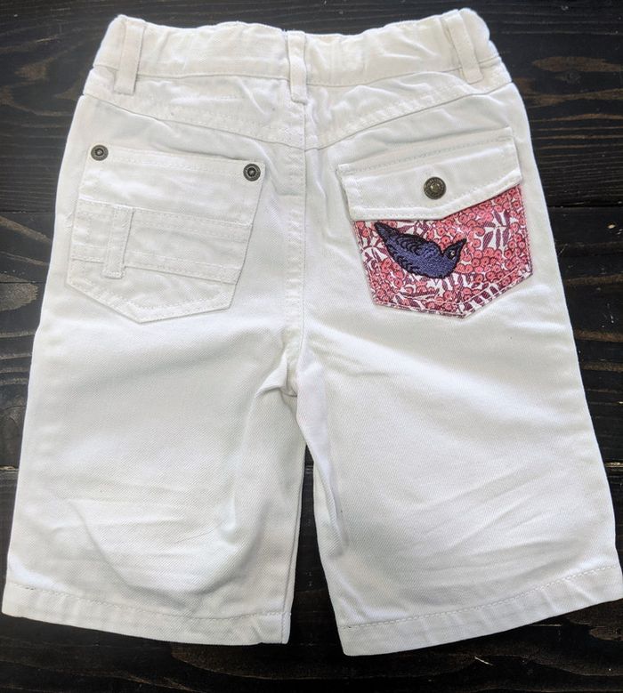 Short blanc bébé fille 18 mois, 81 cm 2 poches avant et arrière, une poche arrière avec impression et oiseau brodé passants au niveau de la ceinture; taille ajustable par élastique à l'intérieur 100% coton de la marque Verbaudet En parfait état