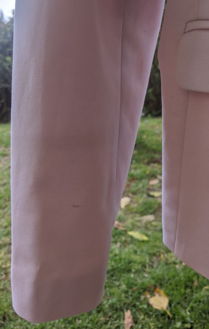 Veste tailleur Camaïeu T40 de couleur rose pâle légèrement cintré 2 fausses poches sur le devant Fermé par un bouton Mise 2 fois une petite tâche sur la manche droite (voir photo 3) Très jolie veste et en parfait état malgré cette petite tâche
