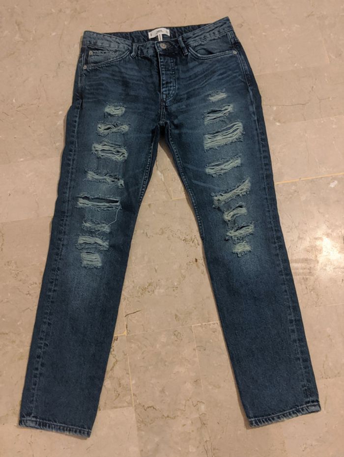 Jean Mango, taille 38 de couleur bleu Troué seulement sur le devant, neuf jamais mis, sans étiquette 38 cm à la taille, largeur jambe 27 cm (voir photo) longueur de jambe à partir de l'entre jambe 72 cm, largeur bas de la jambe 15,5 cm