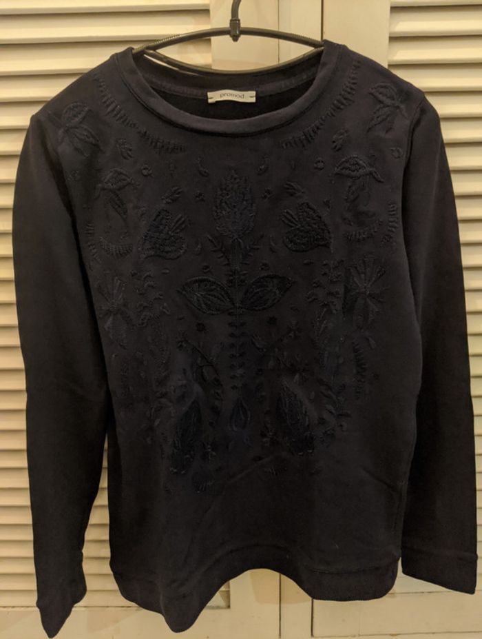 Très joli sweat Promod Taille M Couleur Bleu marine Brodé sur le devant, uni au dos Col rond 100% coton, lavable en machine à 30° En parfait état