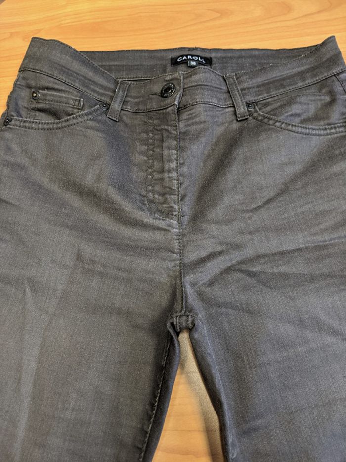 Très beau jean Caroll marron T 38, taille haute (haut dessus des hanches) Tissus du jean légèrement satiné Coupe près du corps, droit Très bon état