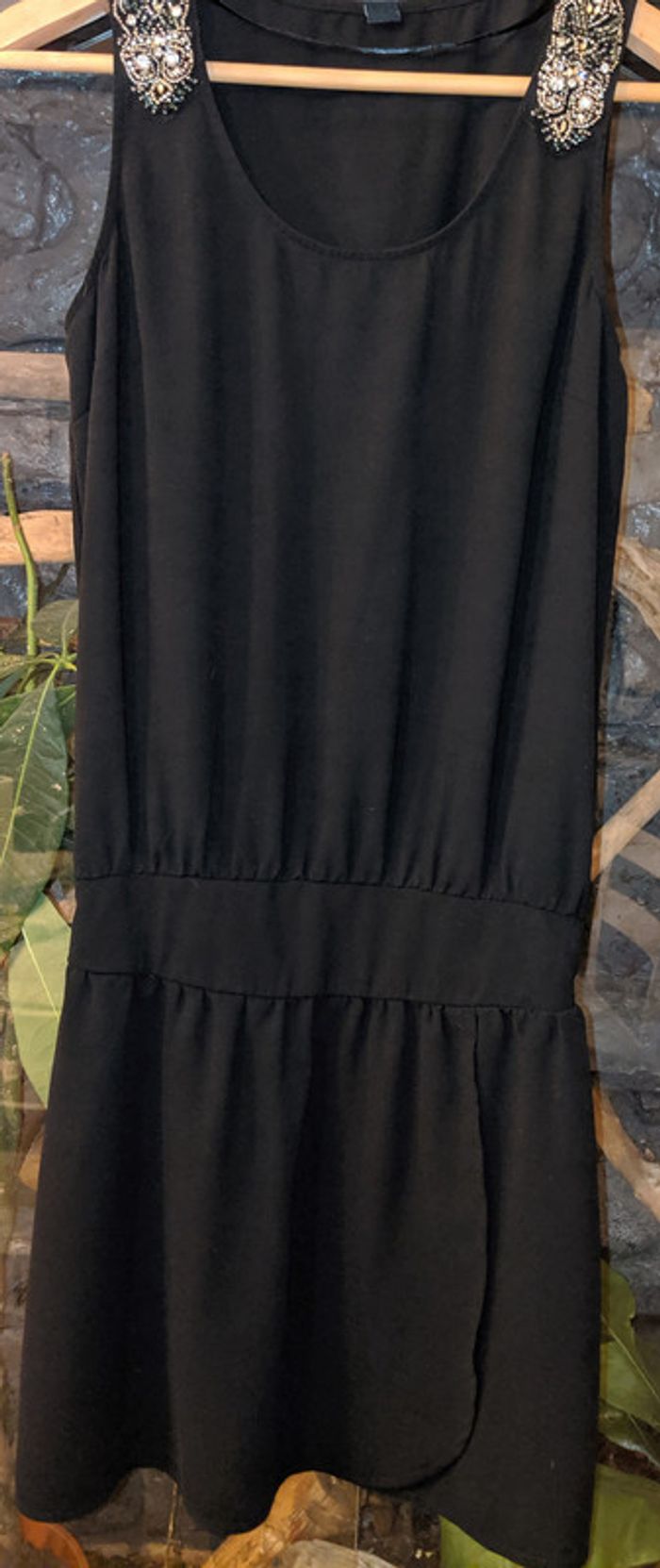 Très jolie robe noire Pimkie Taille 38 Robe fluide non transparente Perle au niveau des épaules Doublé en bas, façon portefeuille mais ne s'ouvre pas. Cintré élastique au dos En excellent état