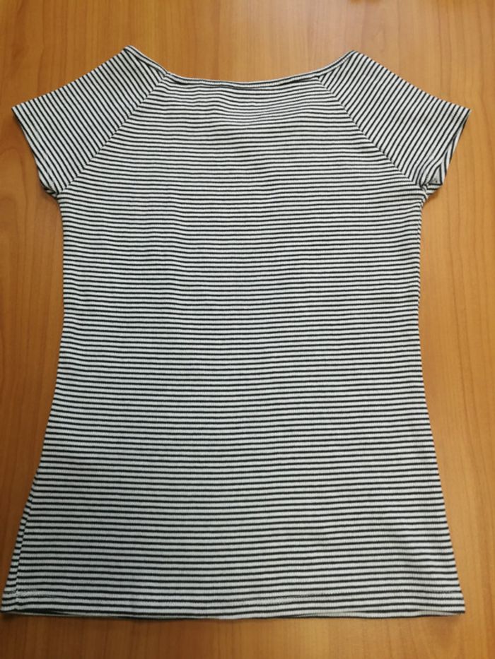 Tee shirt cotelé, rayé blanc et bleu marine Insigne rose en bas à droite du tee shirt Col rond, très agréable au toucher, très doux. 96% coton et 4% élasthane Tee shirt neuf sans étiquette ( ne plaît pas à ma fille).