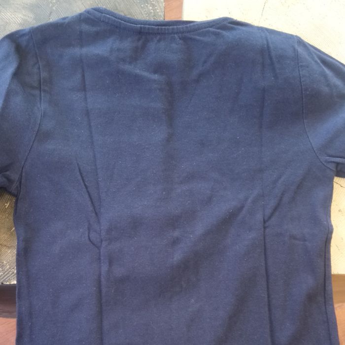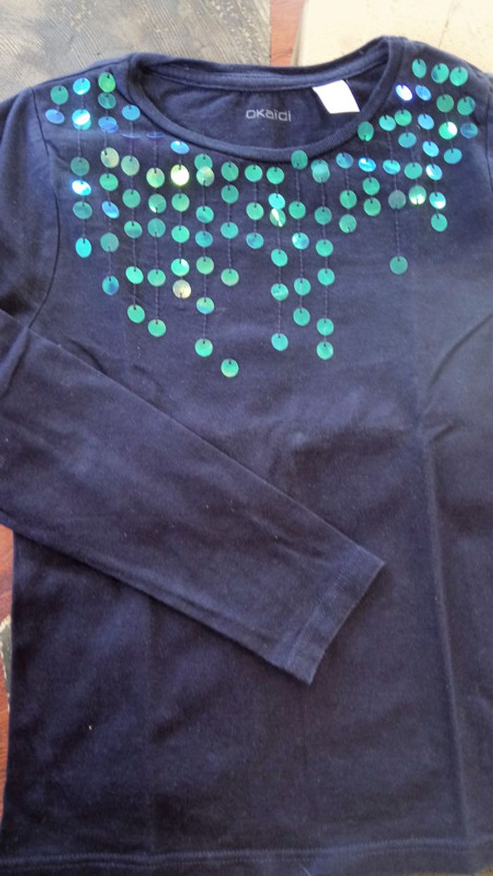 Tee shirt bleu marine, manche longue. Taille 6 ans. Sequin sur le devant, uni au dos. En parfait état.