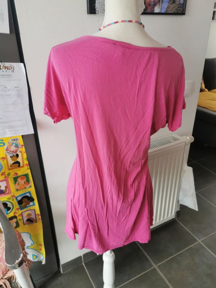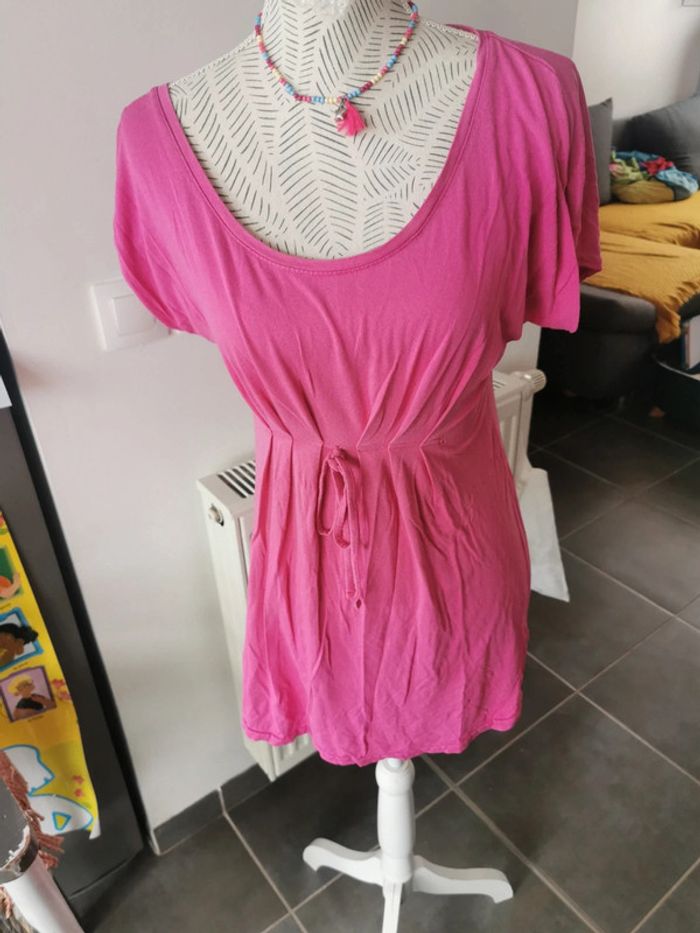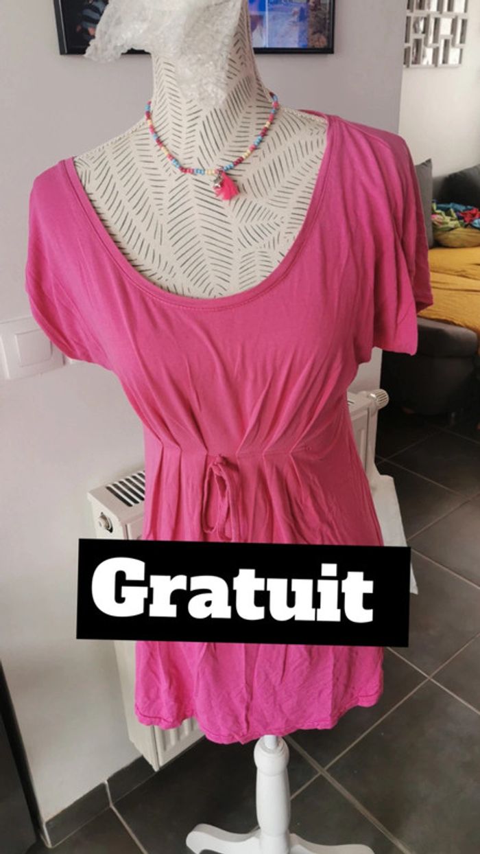 Jolie tunique rose taille L/XL va s'en probleme jusque 44 elle est stretch Idéal pendant la grossesse car bien large et extensible sous la poitrine En bon état mais 2 défauts voir photo Donne pour tout achat