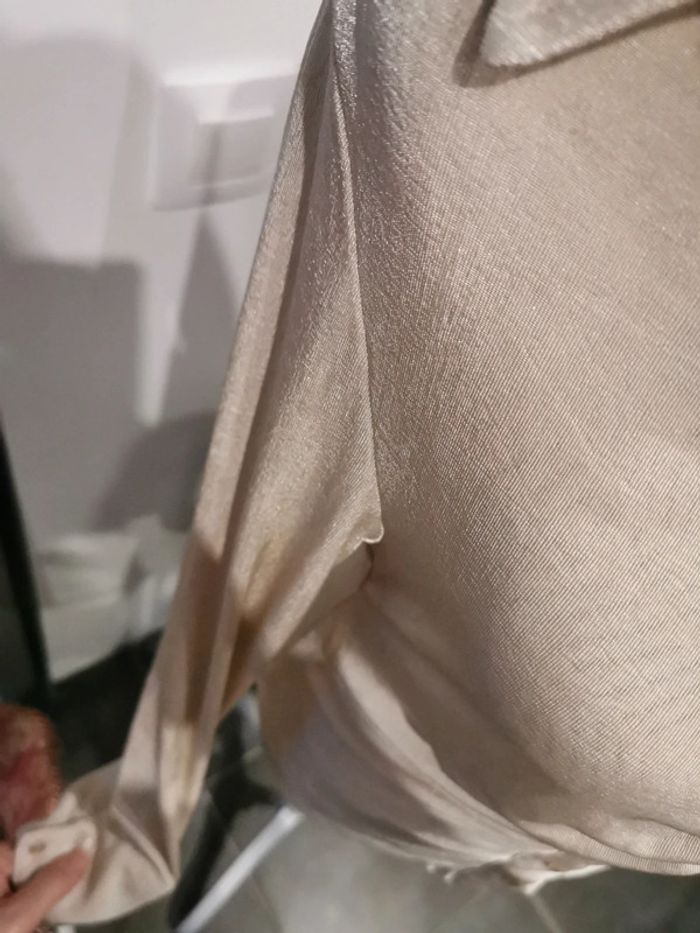 Magnifique chemisier brillant noté taille XL mais va plutôt à un 38- 40 Aisselle à aisselle 44, il est stretch Col V, froncé sur le devant Très bon état général