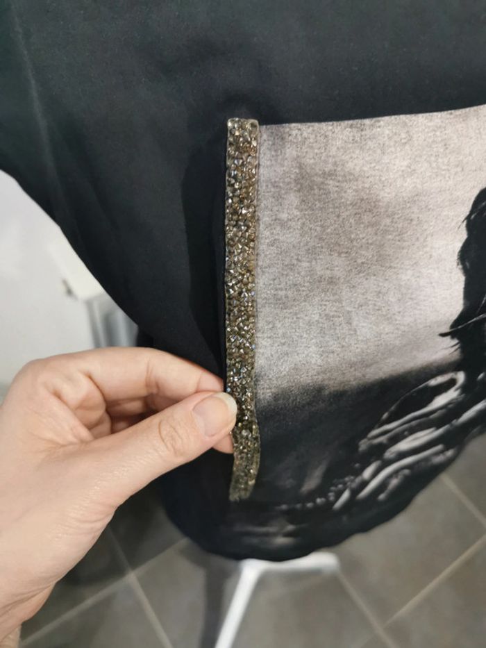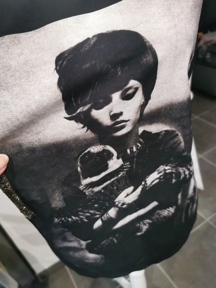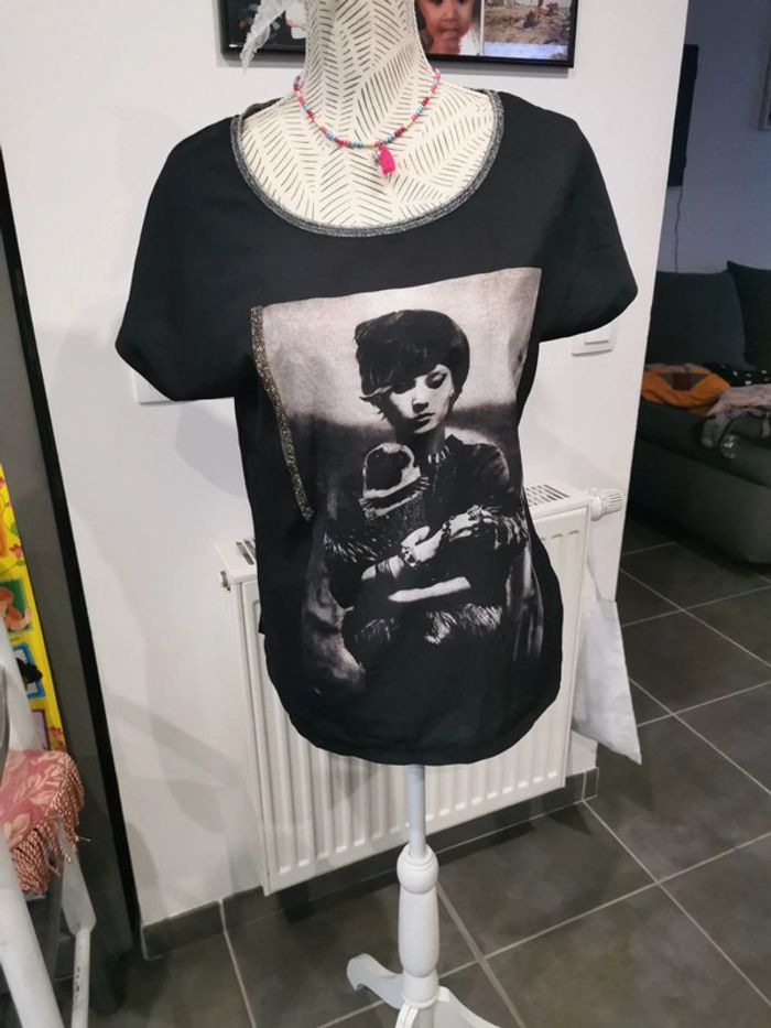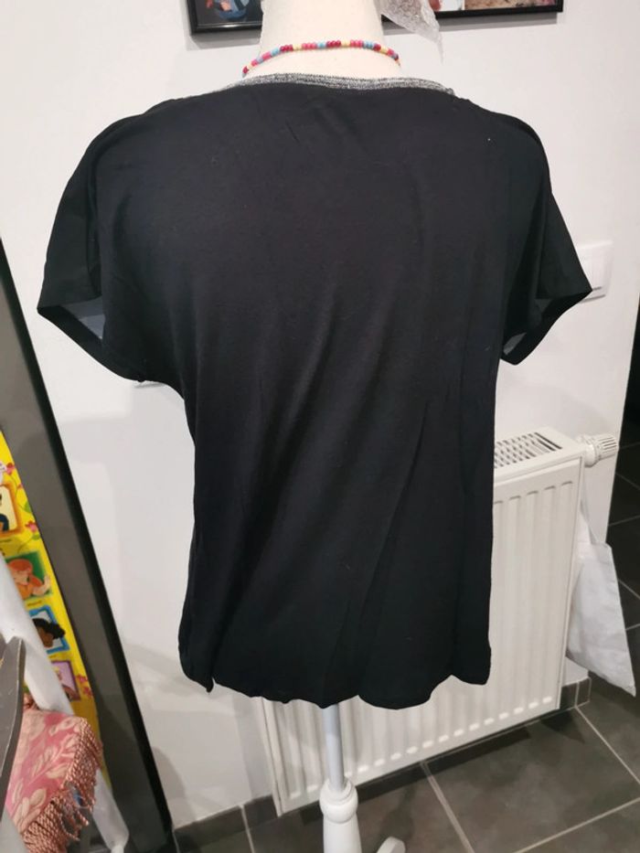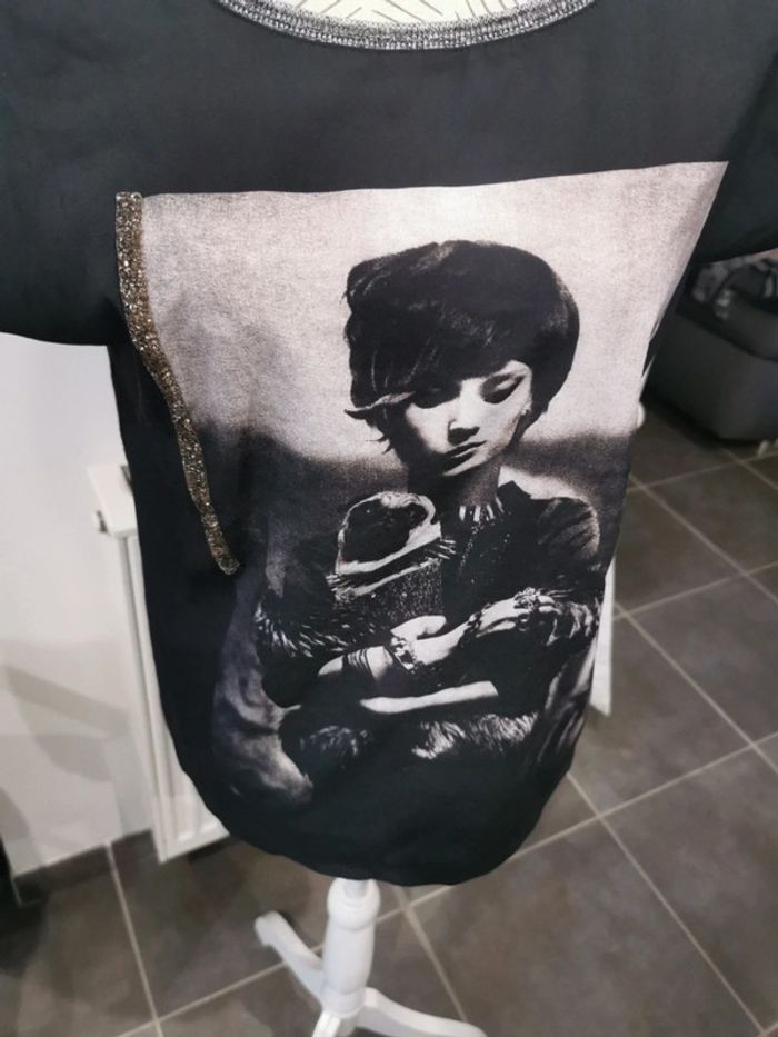 Jolie blouse manches courtes taille L Bi matière, imprimé sur le devant avec strass Très bon état général hormis quelques bouloches derrière peut visible voir photo (ça ressort + en photo)