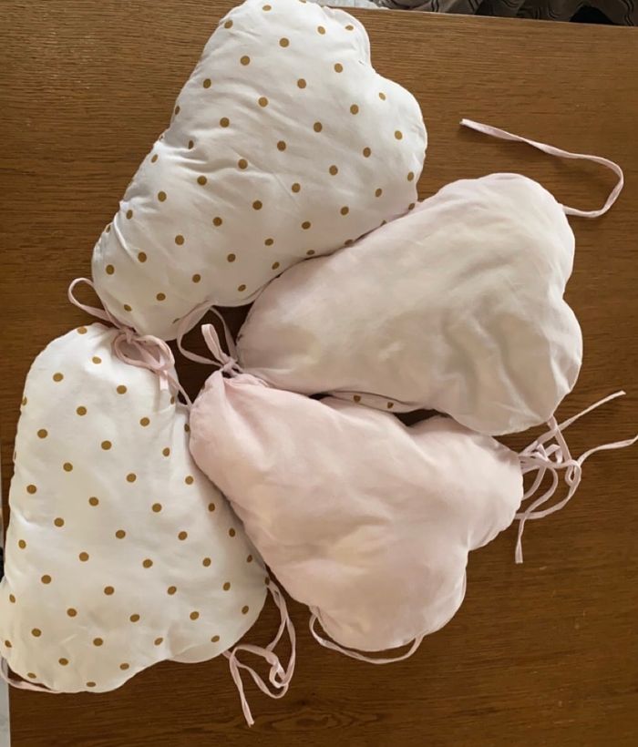 vend tour de lit nuage rose pâle blanc et pois or en bon état. sur un des nuages le rose c’est éclairci par rapport aux autres mais ne gêne en rien l’utilisation