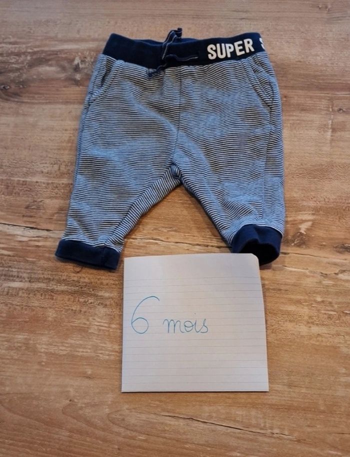 Jogging à rayures bleues et blanches, "super smile" noté sur l'élastique