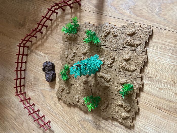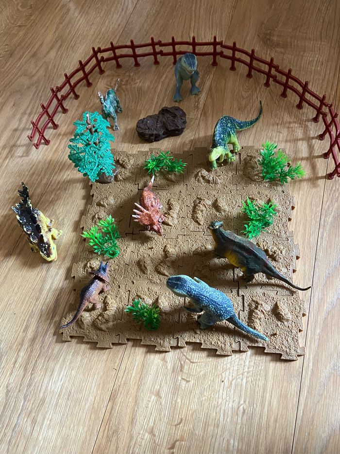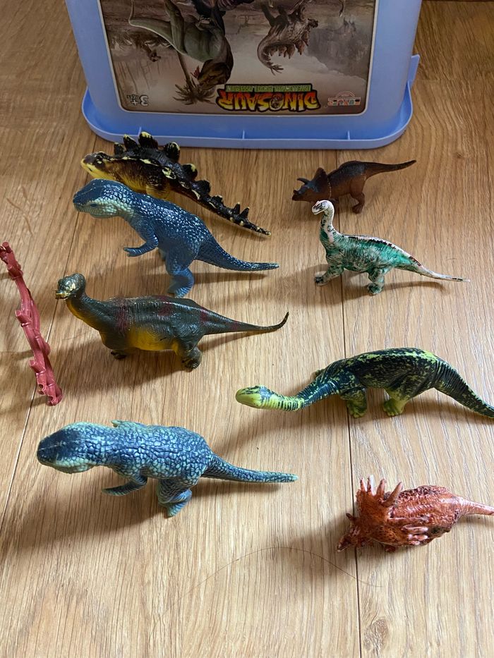 Mallette avec huit dinosaures, le sol, les arbres, tout est en bon état