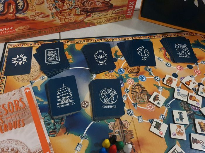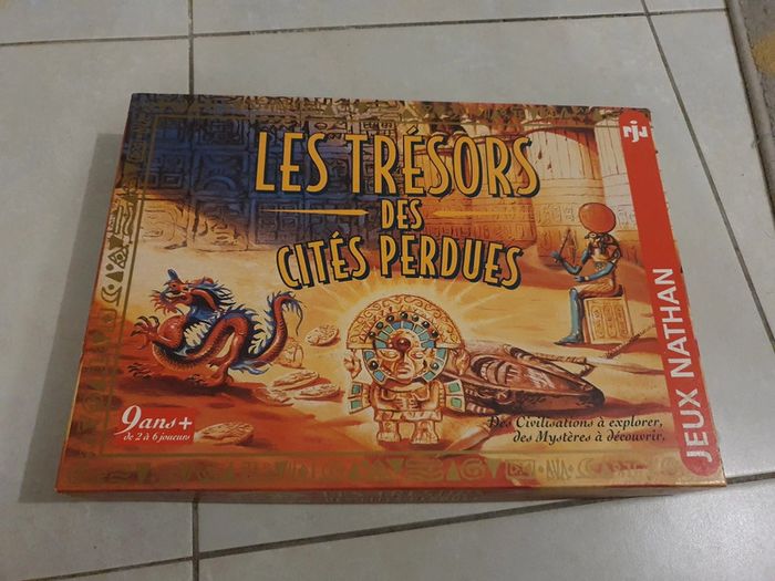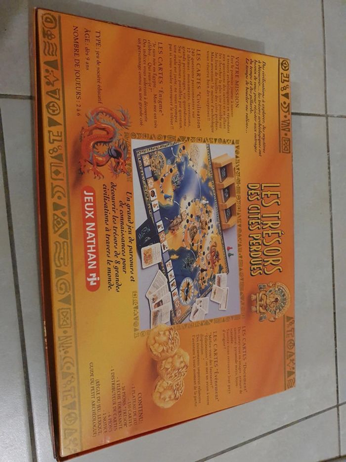 Jeu de société, les trésors des cités perdues. Il manque un trésor mais n'empêche pas le jeu. Ainsi qu'une carte aide mémoire mais la carte est en photo sur la notice. Pour les défauts (voir photo), jeu assez ancien mais reste en bon état. #jeu #jeux #jeudesociete #lestresorsdescitesperdues #Nathan #jouet