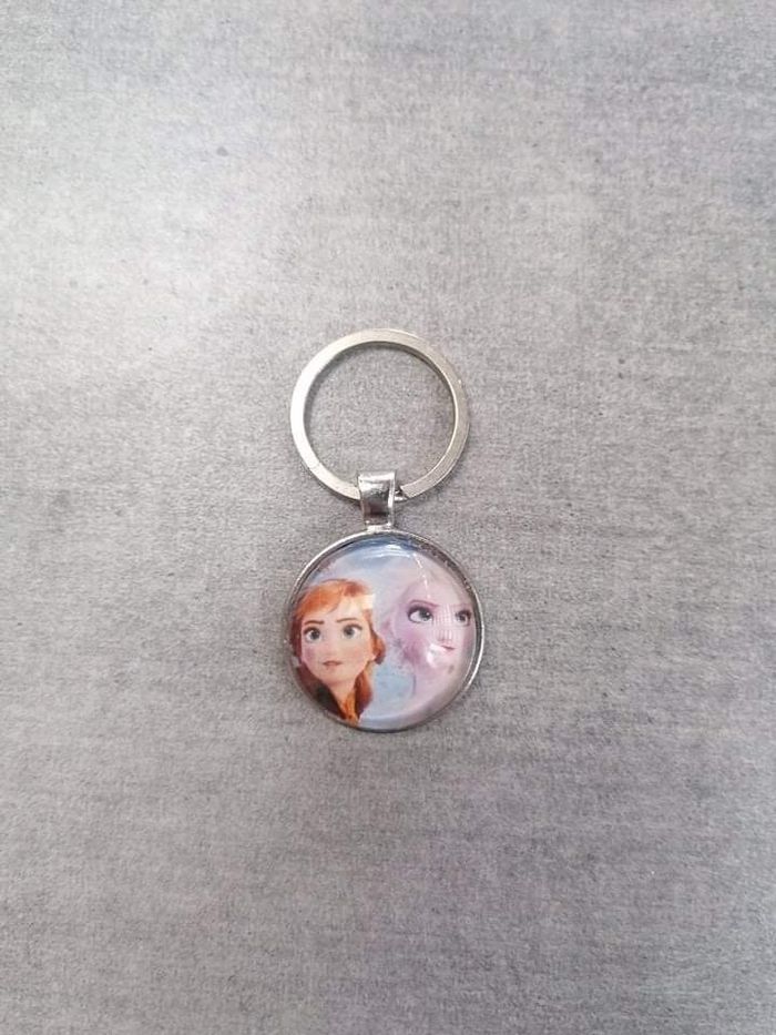 Porte clé avec un cabochon de 25mm de diamètre représentant Anna et Elsa de la Reine des Neiges