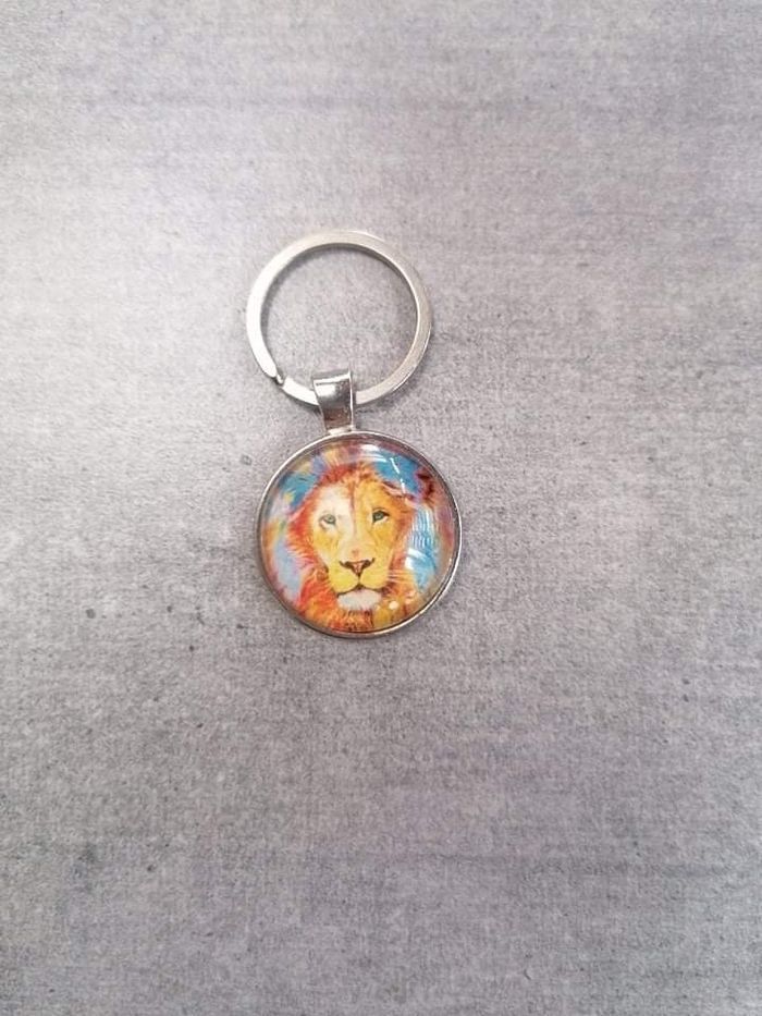 Porte clé avec un cabochon de 25mm de diamètre représentant un lion
