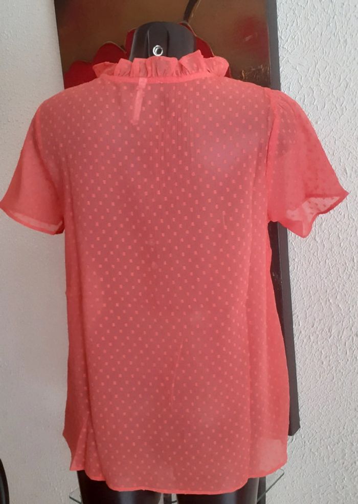 Col rond volantée avec fente V + lien à nouer Manches courtes avec fronces en tête de manche Base droite A porter sur un débardeur pour éviter une trop grande transparence Long. 66 cm env. Voile plumetis 100% polyester Taille : 40 Coloris : corail Prix : 9€ Neuf jamais porté #sisterkayafemmeT40 Réf : à.ei +1
