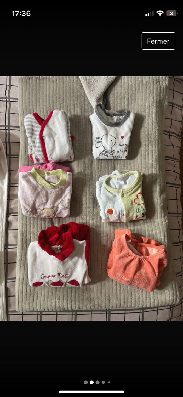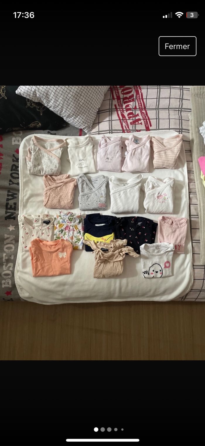 Lots bébé naissance/1mois. 9 body/ 8 teeshirt/ 6 pyjamas/ 5 body short/ 1 robe avec sont chapeau/ 2 legging 15 euros les 30 pièce