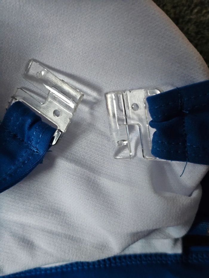 Neuf avec étiquette de couleur bleu et argenté brillant Bas : Longueur totale 38cm réglable par les noeuds Largeur 26.5cm Haut : Longueur totale déplié 82cm Matière 85% polyester 15% elasthane