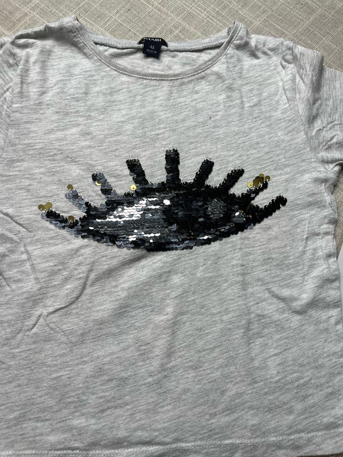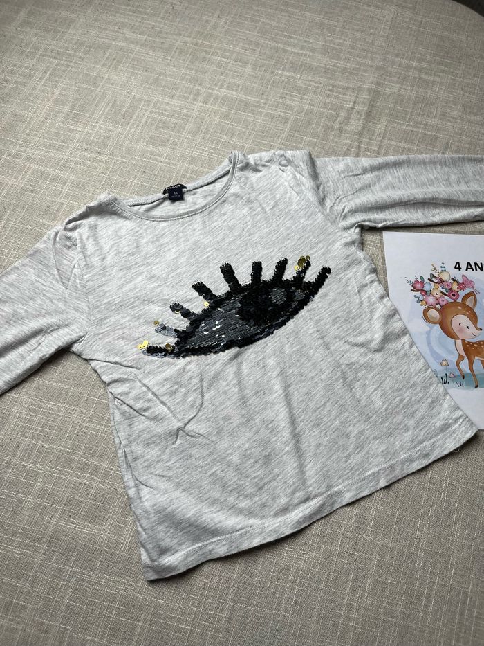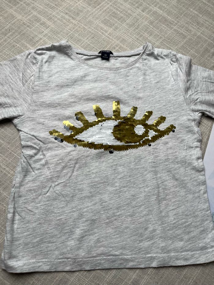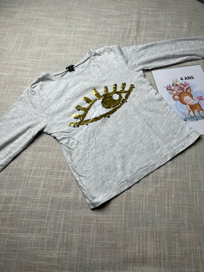Joli T-shirt à manches longues de la marque Kiabi Motif à sequins « œil » Doré ou argenté ? A votre fille de faire son choix Deux petites taches sur la manche (photo) qui partiront sûrement avec du détachant Taille 4 ans Groupez vos achats pour profiter des remises activées sur les lots et réduire vos frais de port #chrisbc17fille4ans
