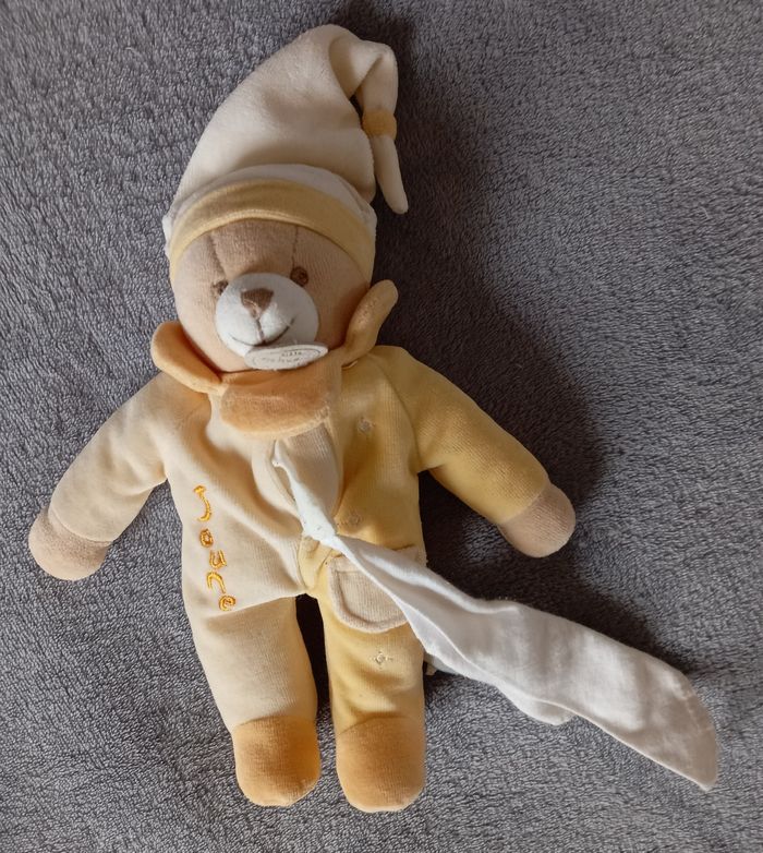Doudou et compagnie peluche ours en velours de couleur jaune 2 tons Écriture brodée sur le doudou " jaune " Mouchoir en tissu de couleur blanc qui sort de son ventre