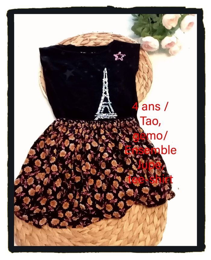 4 ans  Ensemble/  tao,  gemo jupe fleurie doublé et Tee-shirt tour eiffel a sequin printemps été /excellent état comme neuf - photo numéro 1