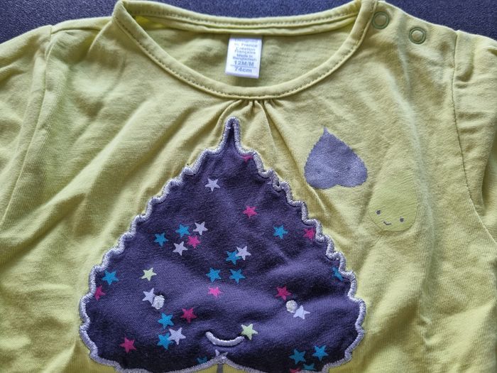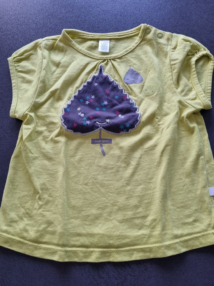 T-shirt manches courtes vert (motif feuille), Obaïbi, 12 mois. Très bon état Possibilité de faire un lot. N'hésitez pas si questions ou besoin d'autres photos.